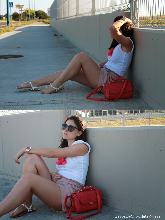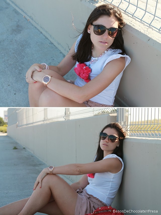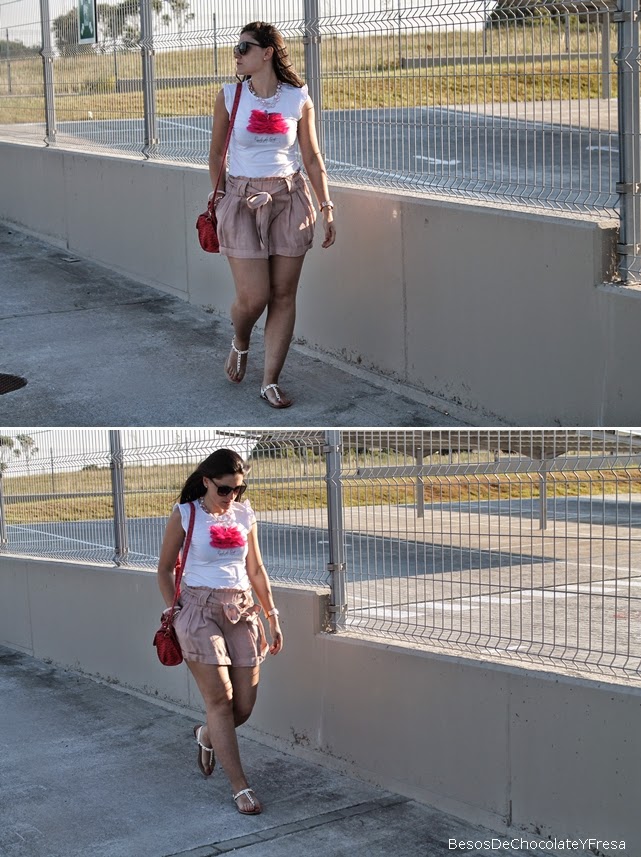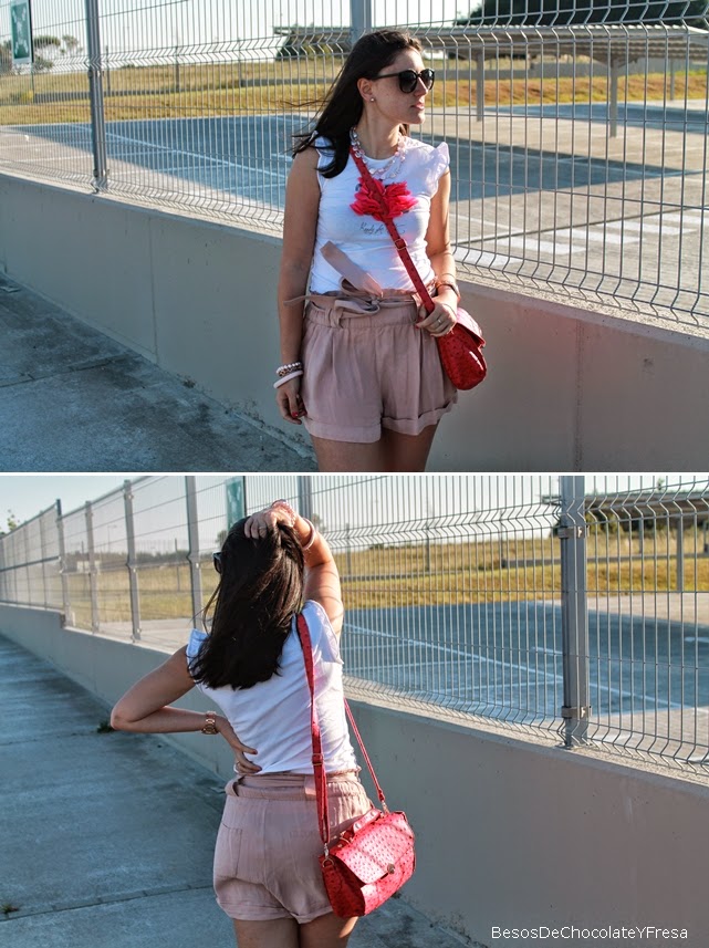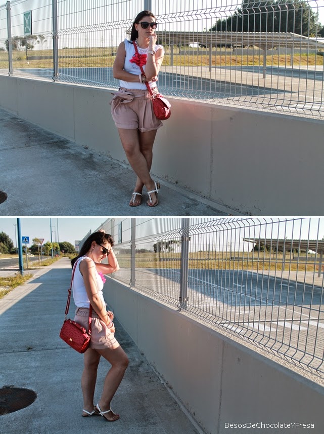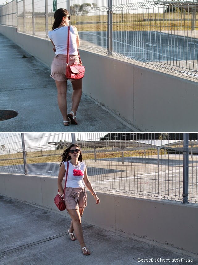 Para ello llevo bermudas super fresquitas con lazada en la cintura en color salmón, camiseta blanca con detalles en rosa y volantes en las mangas, bolso rosa de piel de avestruz y sandalias de pinchos en blanco. También detalles en rosa son las pulseras y el collar de bolas.