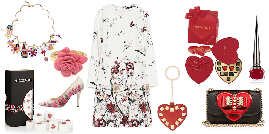Collar con charms de flechas, corazones y frutas es de Bimba y Lola, perfecto para esta primavera-verano, díselo con flores y esta es para toda la vida, anillo con flor de Marc Jacobs, vestido estampado de Zara, zapatos de Hogl, el chocolate y el dulce es otra forma de expresarnos y estos son de Armani Dolci, terrones de azúcar de Zucceroo, llavero en forma de corazón con remaches metálicos de Valentino, el bolso con corazón es de Christian Loubutin, que mujer no sueña con unas suelas rojas, muchos no podemos alcanzar ese sueño y como opción os propongo esta laca de uñas de la misma firma.