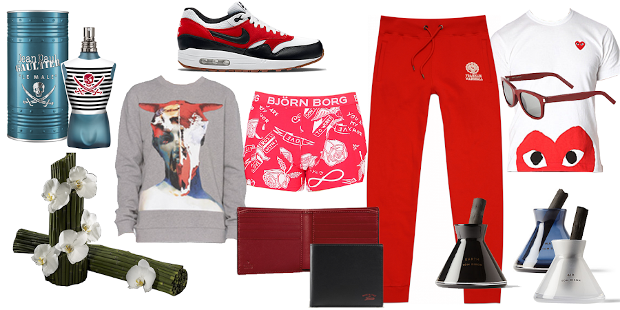 La tendencia sport cada vez esta mas presente en los looks masculinos, y sumándonos a esta tendencia he pensado que este pantalón slim de Franklin a Marshall, la sudadera con mezcla de diferentes prints muy presente en muchas colección y firmas es de Givenchy, el corazón es la expresión del amor y cualquier prenda de la colección Play de Comme des Garcons es perfecta, las gafas rojas tipo wayfare con espejo son de Saint Laurent, la ropa interior es una edición limitada con motivo de este día de Bjorn Borg al igual que el perfume de Gaultier.