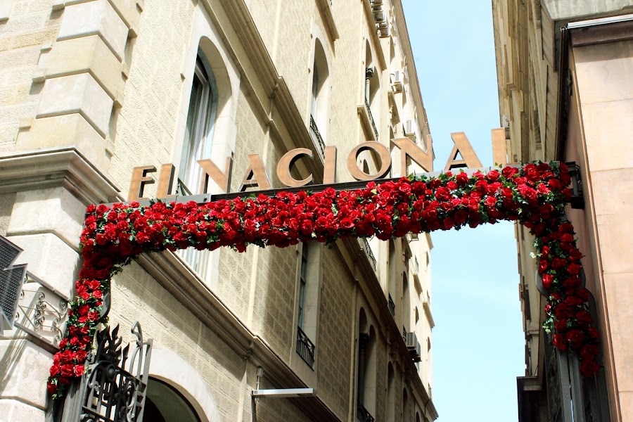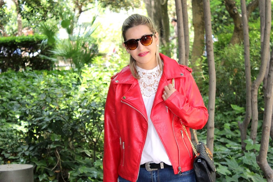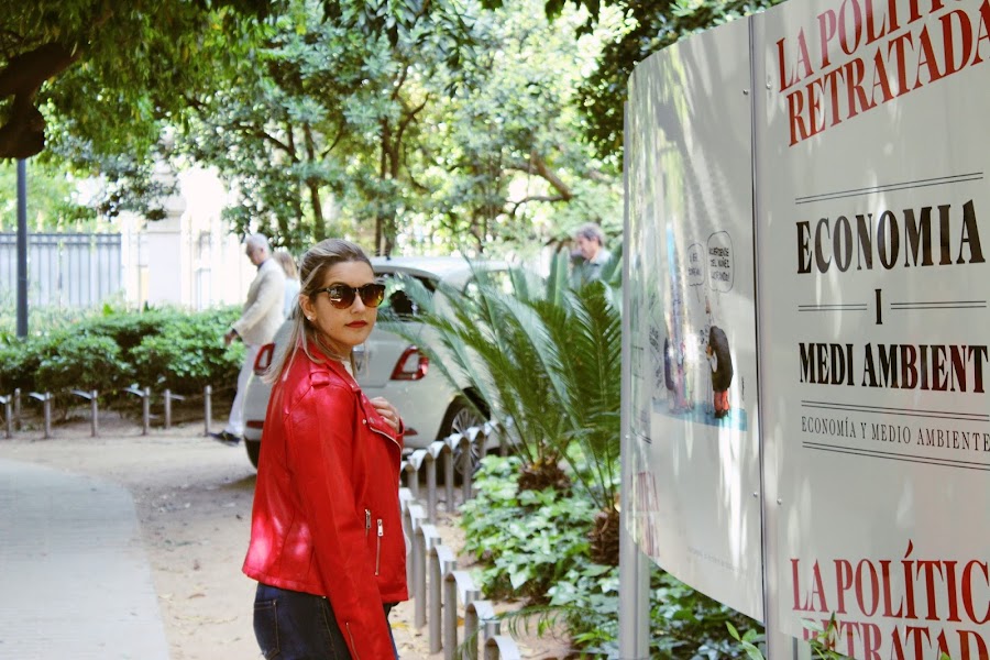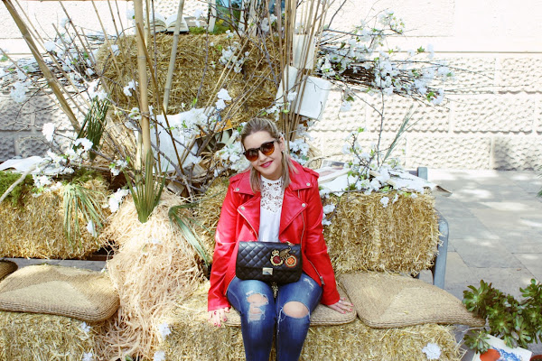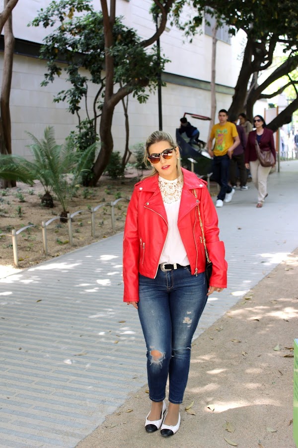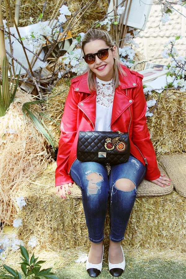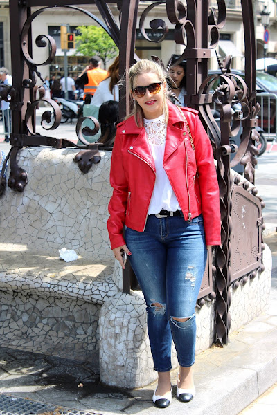 This Sunday to celebrate Saint Georges Day, we went to do a walk to Paseo de Gracia and Rambla Catalunya that it was full of books and roses. For this occasion, I chose a casual outfit with a white shirt with lace, jeans and my new red leather jacket. The accessories of the day were my new black and white flats and my black bag with parches. A comfy and easy outfit that it was perfect to walk for the town.