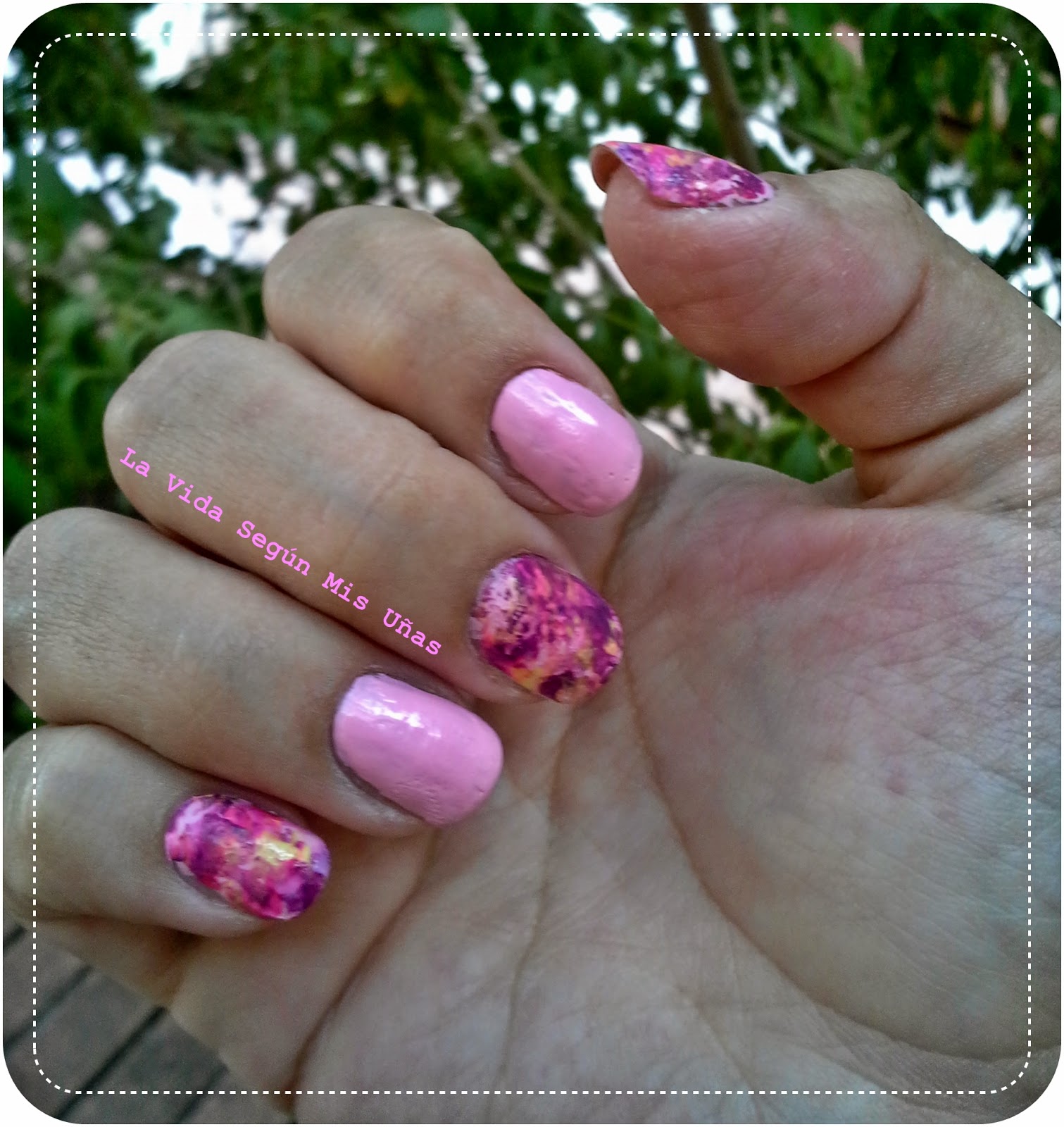 En mi caso, lo que hice fue poner distintas gotas de los colores que quería en un trozo de plástico y luego lo doblé por la mitad para que se mezclaran los colores, luego desdoblaba el plástico y, lo único que tenía que hacer era pasar el plástico por la uña para pasar el diseño a la uña. En mi caso, he quedado super contenta con el resultado de esta manera de hacerlo pero también probaré otras a ver que tal. Como he dicho antes, no realicé la técnica en todas, dejé las uñas anular e índice en rosa pastel para suavizarlo.