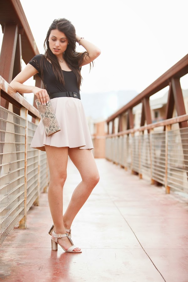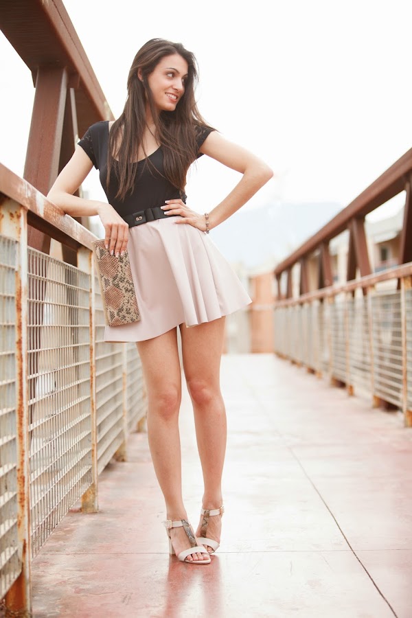 Sin duda... ¡Ha llegado el calor! Hoy os dejo un outfit que me encanta. Aunque pueda parecer... ¡No es un vestido! Es una falda estilo skater de polipiel rosa palo con la cinturilla en negro y por otro lado un body. Ambas cosas son de temporada de la firma italina SCUSI que la podéis encontrar en MARTHINA. Me parece una combinación muy fina, femenina y elegante junto mis nuevas sandalias y mi nuevo bolso de D"ANGELA combinados en estampado de serpiente. Repito con la marca tras este invierno hacerme con unas maravillosas RAIN BOOTS ¿Las recordáis?Espero que os encante tanto como a mi el conjunto y las fotos de hoy. Un besazo enormeeee!!