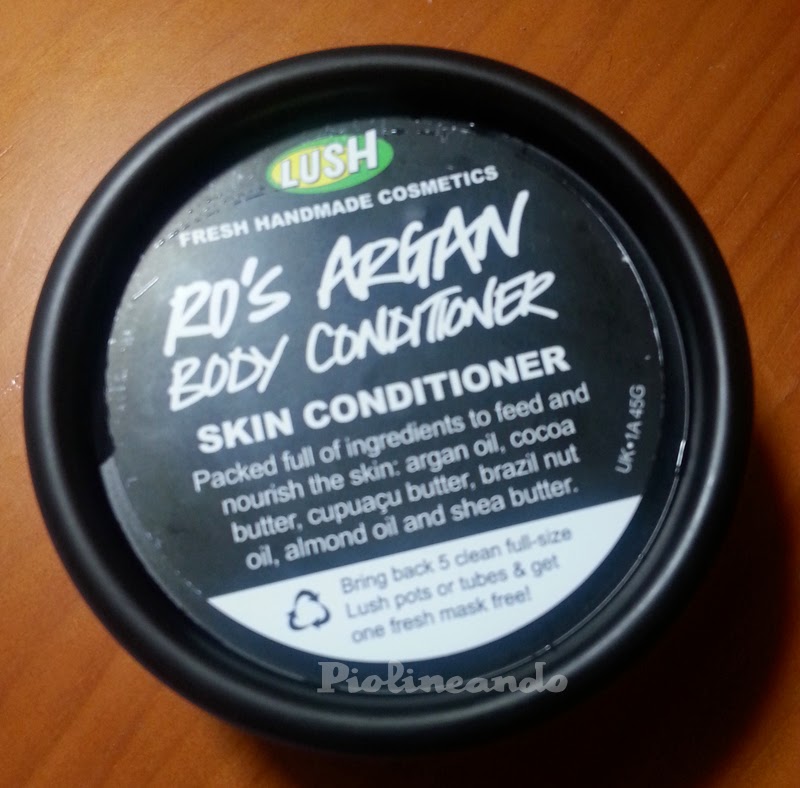 El Ro"s Argan de Lush es un acondicionador corporal, que aplicamos en la ducha, después de aclararnos el gel. Lo ponemos en la piel como si fuera una crema corporal, lo aclaramos con agua y cuando salimos y secamos la piel (suavemente, a toquecitos, sin arrastrar), está hidratada y jugosa.