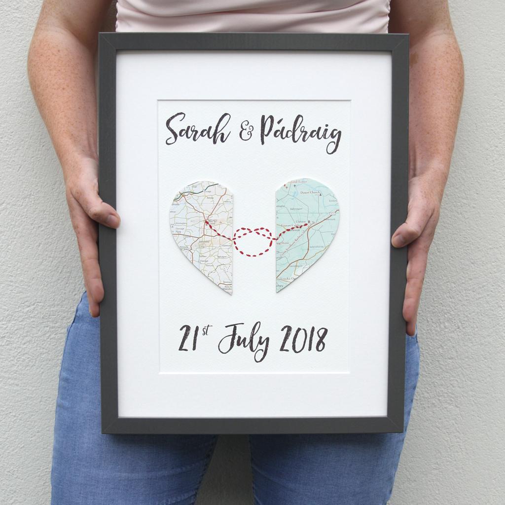 Si tu pareja y tu se conocieron estando en ciudades o países distintos y cruzaron el amor por el puente, un cuadro donde se escriban el recorrido de la unión es perfecto.Servirá como decoración para cualquier espacio de la casa donde vivan. Recordar de donde son y a dónde fueron en busca del amor, es un regalo de aniversario maravilloso.