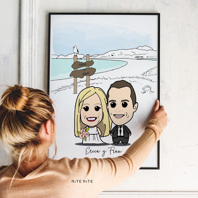Un hermoso detalle, una caricatura de ambos que recree un día especial, como el día de su boda.Es un regalo para aniversarios que a cualquier pareja le debe alegrar el día donde celebran la unión que tanto forjan a diario.