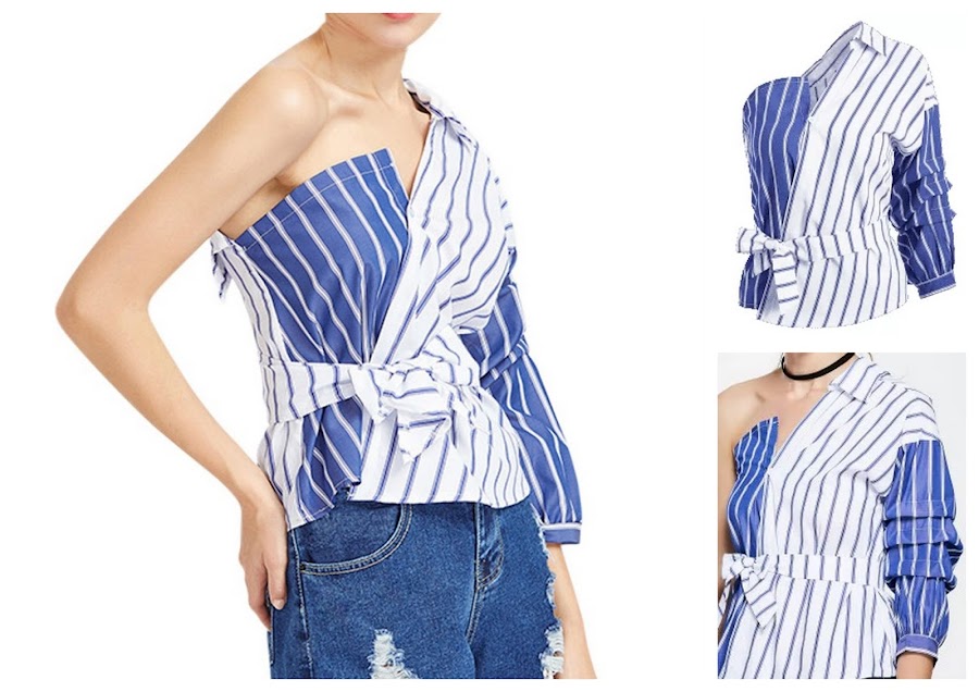 2. Bandas Con Cinturón Una Blusa De Hombro - Raya, confeccionada en algodón y poliéster en dos tonos de rayas. Su tallaje va desde la S hasta la L. Les dejo el enlace directo