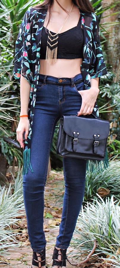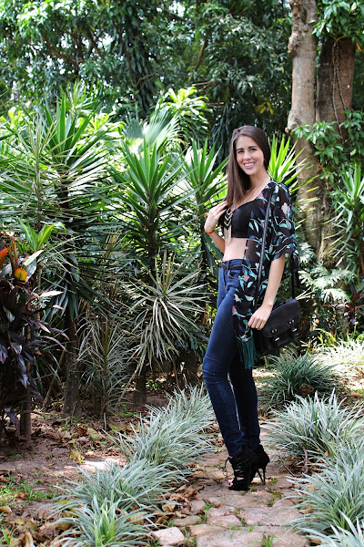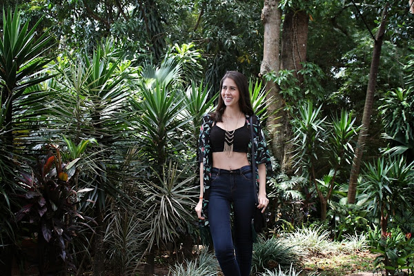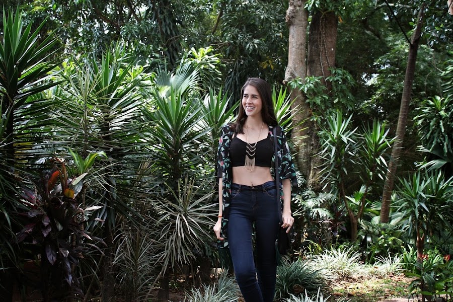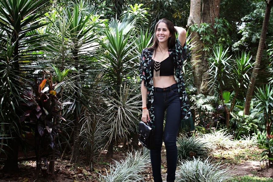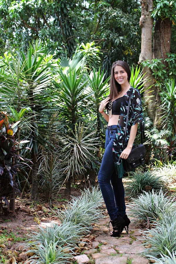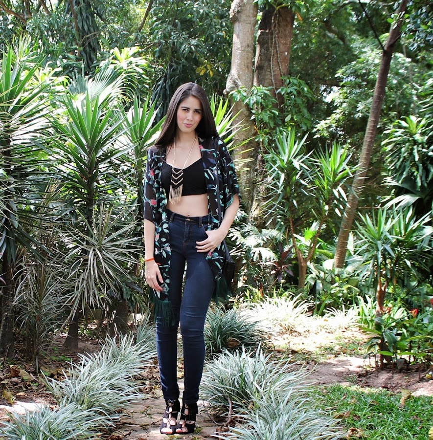 Kimono: By Kathamandu / Crop top: Pantaletasdecostal / Jean: Forever21 / Collar de pluma: LuJo Accesorios / Zapatos: Aishop / Bolso: Balu