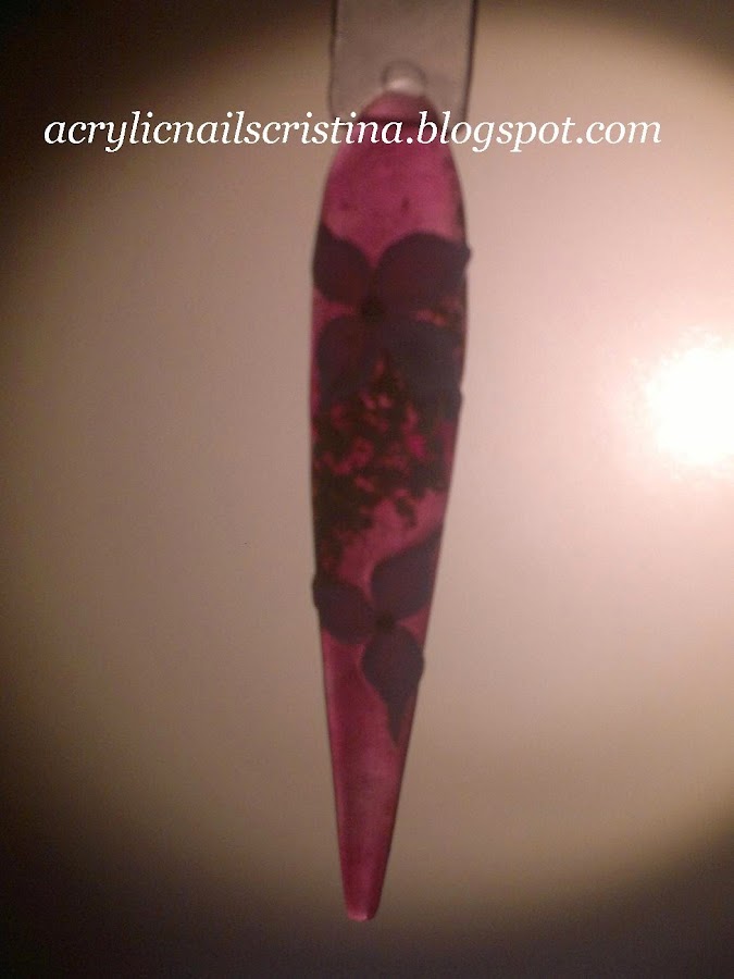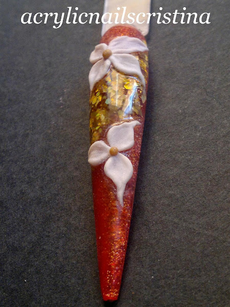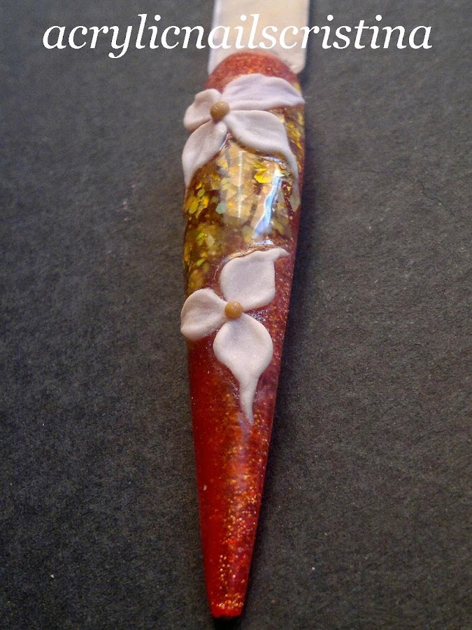 En este caso mezcle un esmalte rojo y uno dorado, además le he puesto purpurina de diferentes tamaños en dorada y las flores 3D.