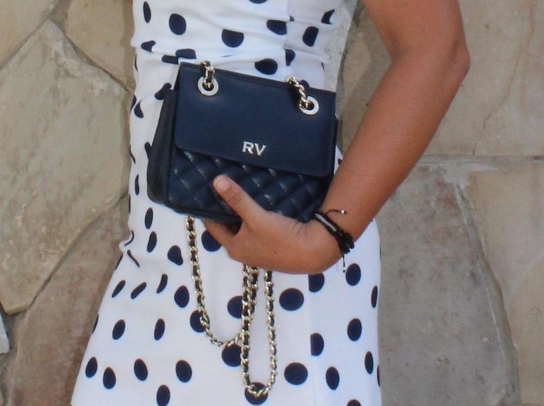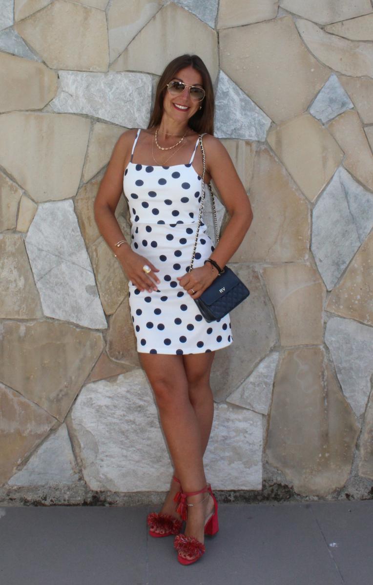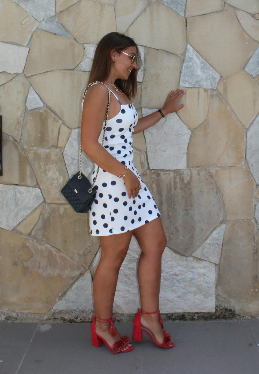 Un vestido de tiras finas y ajustado, vamos un vestido de verano de los de toda la vida, con fondo blanco y estampado de lunares en color marino.