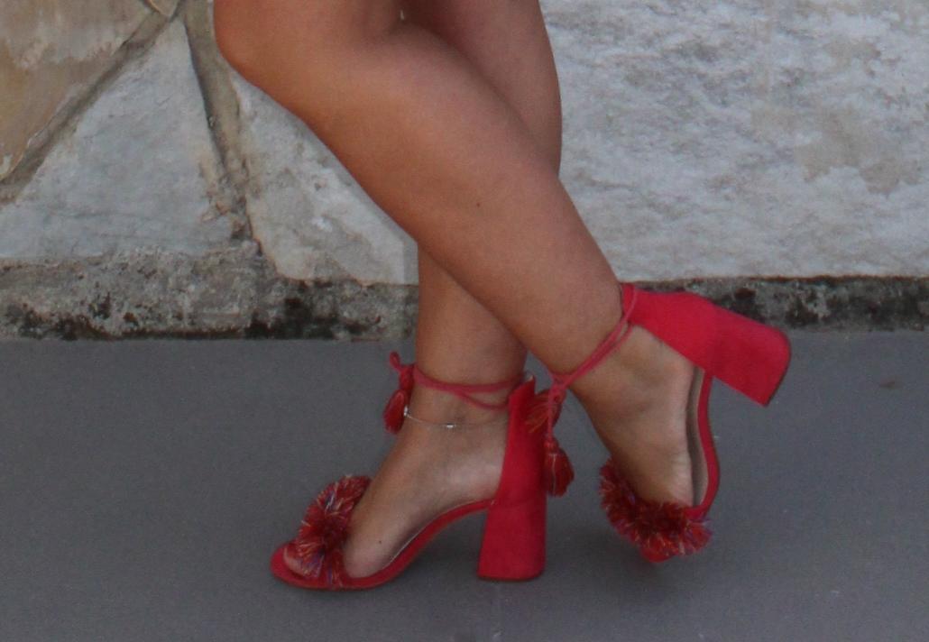 En mi caso, lo combiné con bolso en azul petroleo y la nota de color la ponen las sandalias de pompones en color rojo.