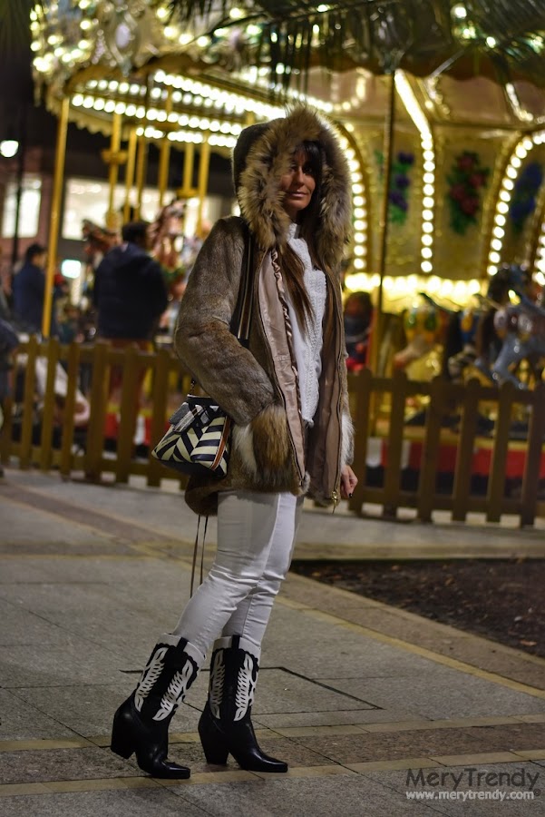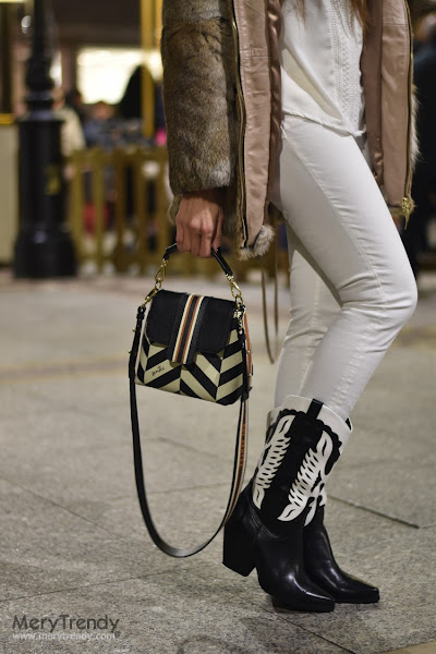 Como decidí construir el look partiendo del mismo, rápidamente se me vinieron a la cabeza mis botas cowboy negras de Exè Shoes que, seguro, también recordaréis porque, en su día, cuando las estrené, quizás por su diseño motero, tan cañero, no dejaron indiferente a nadie (véase aquí). De hecho, estas botas, fueron la razón por la que escogí el modelo TICA en vez del CANDY flúor (véase aquí) que también me chiflaba... pero necesitaba algún bolso que "casase" con este tipo de calzado y consideré que esta era la opción perfecta.