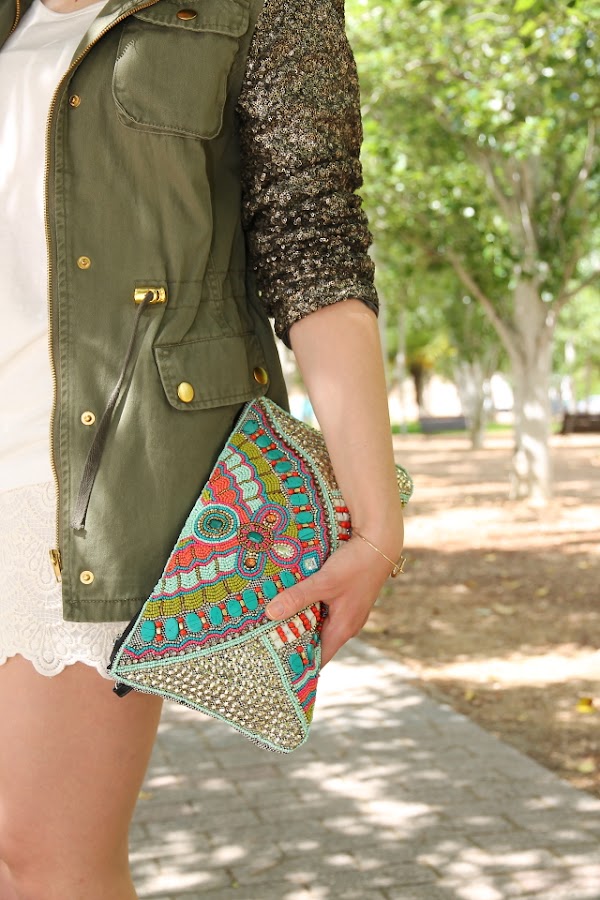 Hace un tiempo aquí hice un post de inspiración hablando de las slip on, allí os comentaba que me encantaban y que tenía seguro que me haría con una de ellas, pero por entonces dudaba sobre el modelo que elegir. Pues bien, me gustan tanto que al final no me he cogido uno sino tres modelos diferentes que poco a poco os iré mostrando en el blog. No me canso de llevarlas porque estoy encantada con ellas, además de ser comodísimas consiguen dar un toque a los estilismos que no puede gustarme más. En este look tan casual con chaqueta de pailletes, camiseta básica y falda de encaje opté por mis favoritas, las slip on con estampado de leopardo. También aproveché para estrenar mi nuevo clutch, tiene tantos colores que ya me lo puedo imaginar este verano con infinidad de looks.
