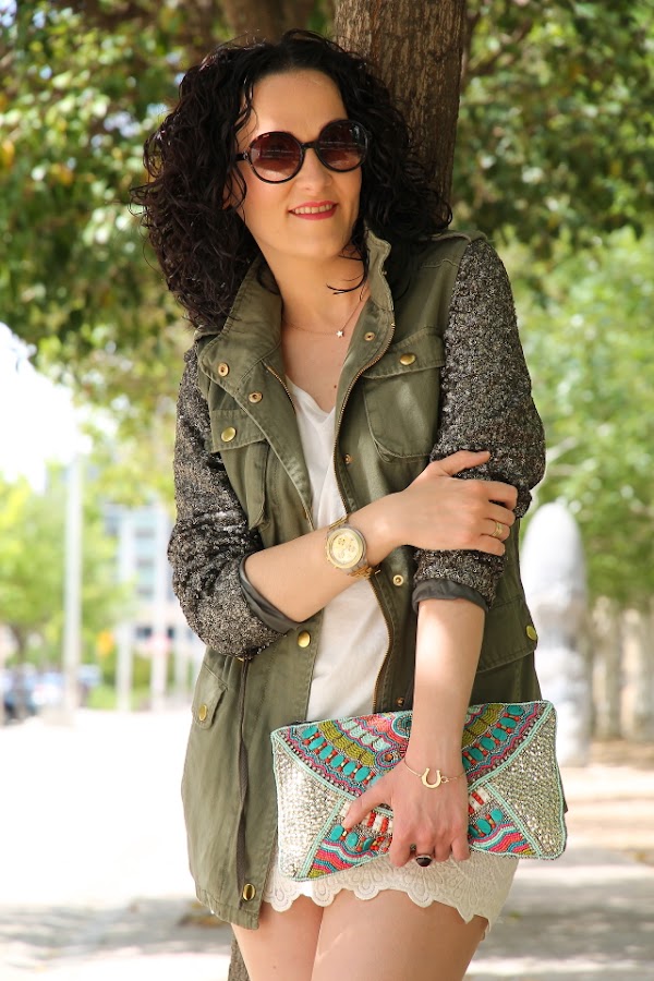 Chaqueta y Clutch: Primark. Camiseta y Gafas de Sol: Mango.