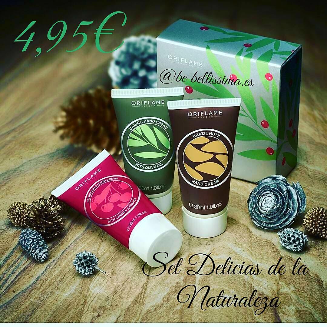 Tres Cremas de manos con deliciosos aromas en tamaño compacto, hidratantes, con extractos naturales de Nuez de Brasil, Cerezas o Aceite de Oliva, en una exclusiva cajita, para unas manos acondicionadas y deliciosamente perfumadas. Set Delicias de la Naturaleza.