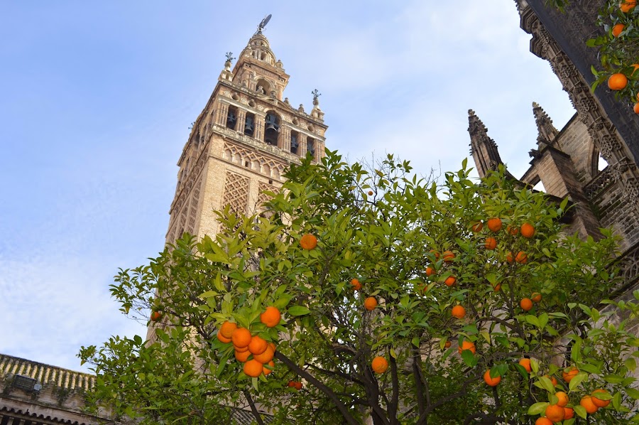 La Giralda vista desde el Patio de los Naranjos y la Torre del Oro.