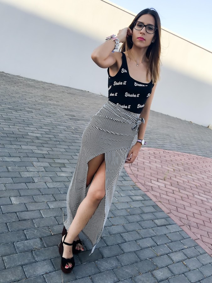 Me encanta el look de hoy y estaba deseando enseñaros esta maxi falda tan original. Tiene corte asimétrico, cruzada por delante dejando una raja lateral que deja ver una pierna. De rayas en blanco y negro y además, trae un fajín que puedes anudar donde quieras, bien en la cintura o bien en la cadera.