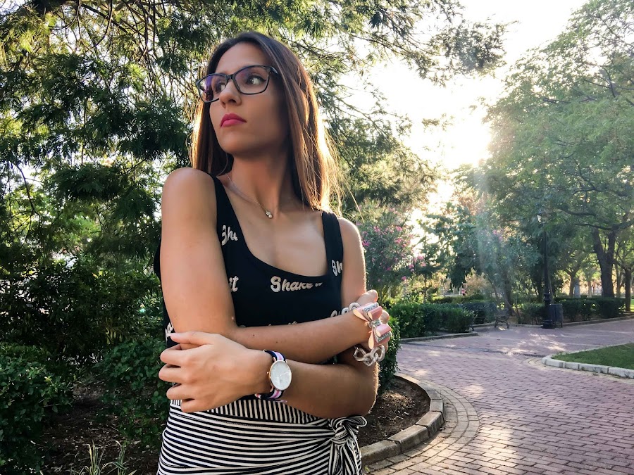 La he combinado con un body muy original negro con un estampado "shake it" en blanco, mis sandalias de plataforma y como complementos mi reloj de rayas con un toque rosa de Daniel Wellington y una pulsera súper chula de lazo rosa.
