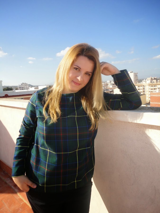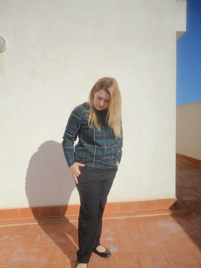 Para la blusa he repetido este patrón, me gusta porque es sencillo y se hace enseguida! Me gustan mucho la telas de cuadros tipo "uniforme escolar" o "tartan", otra manera de llamar a estos cuadros. Lo malo es que se deshilacha muchísimo y he tenido que reforzar bien las costuras.