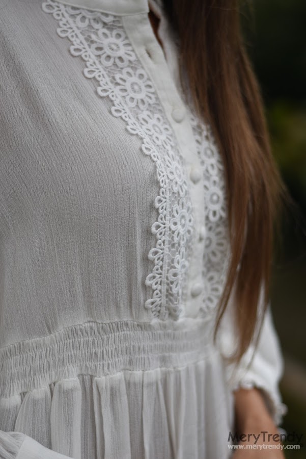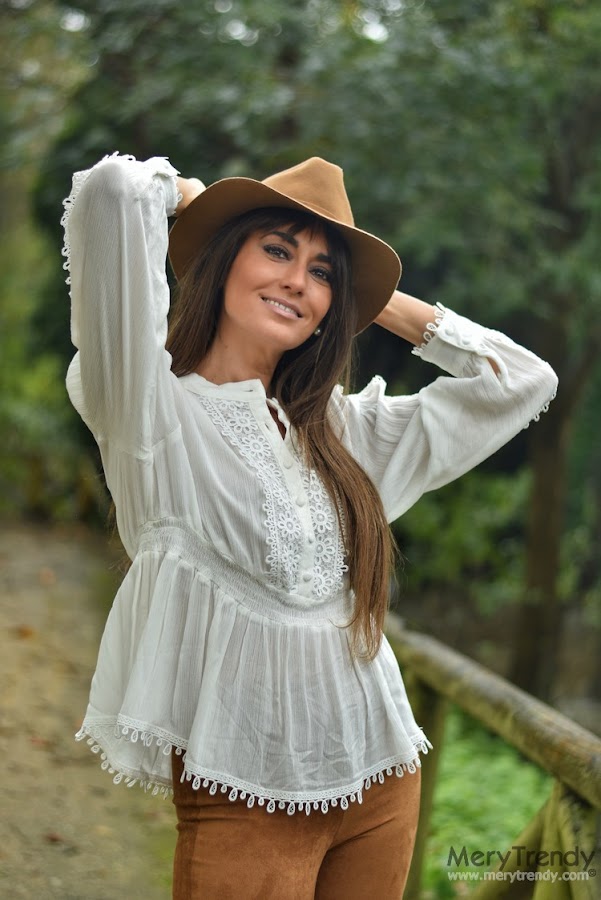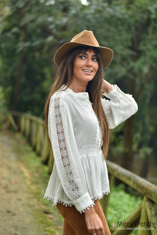 y, del otro, una blusa con cinturilla elástica y ribete de puntilla en las mangas, que he combinado con unos leggings de ante.