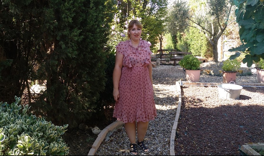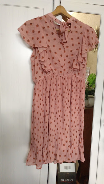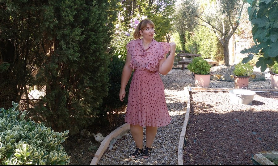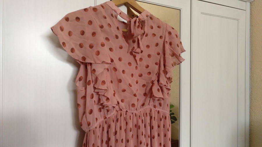 Es un vestido vaporoso con una tela de lo más fresquita y estampado de lunares, su color rosa y sus volantes lo hace especial en la zona alta del cuerpo y la falda plisada le da movimiento. Si os gusta lo podéis encontrar AQUÍ.