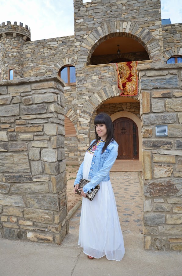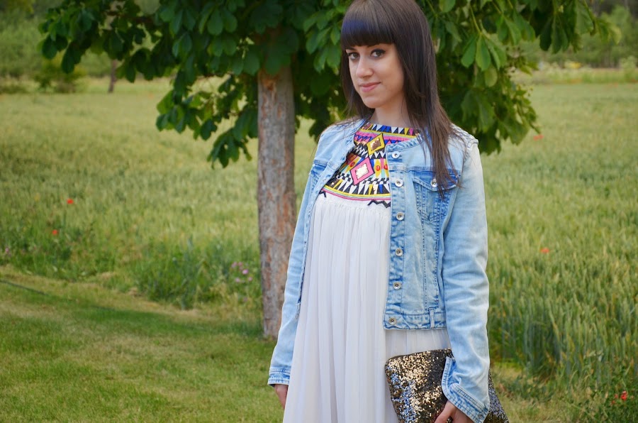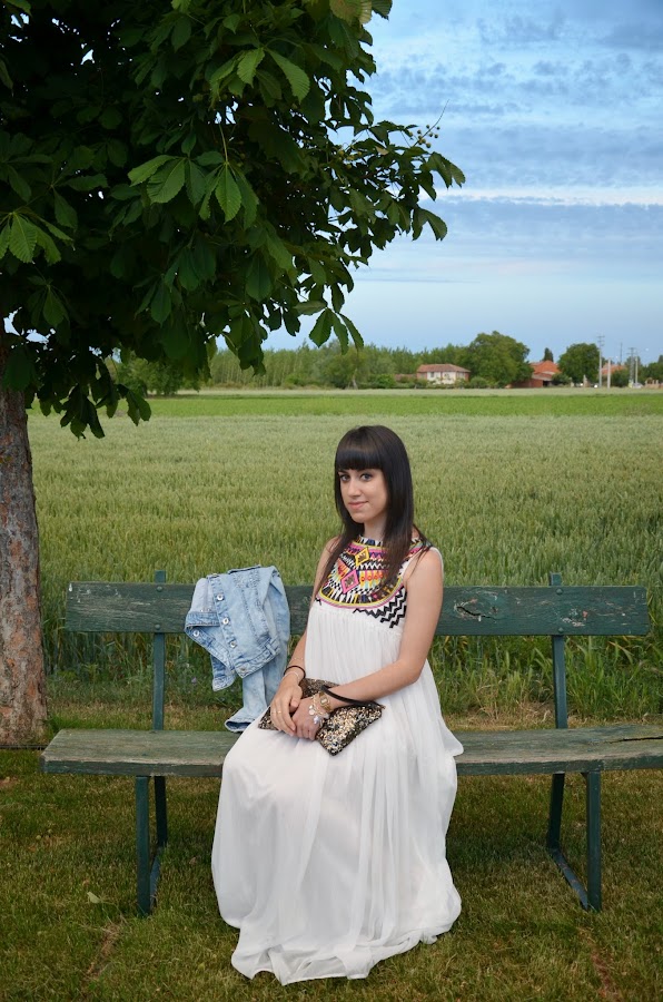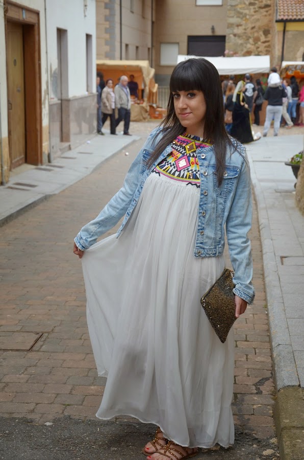Es una prenda que me encanta para el verano, para caminar por la playa o para paseos nocturnos, una prenda muy cómoda y vistosa. Para combinarla elegí calzado plano, es un vestido que no me pedía tacones y con estas sandalias estilo romano lo hace un look de lo mas cómodo. El día estaba algo fresquillo así que fue la ocasión ideal para estrenar esta cazadora vaquera que me regaló mi padre hace unos días, y de complemento, el ya conocido bolso de lentejuelas doradas.