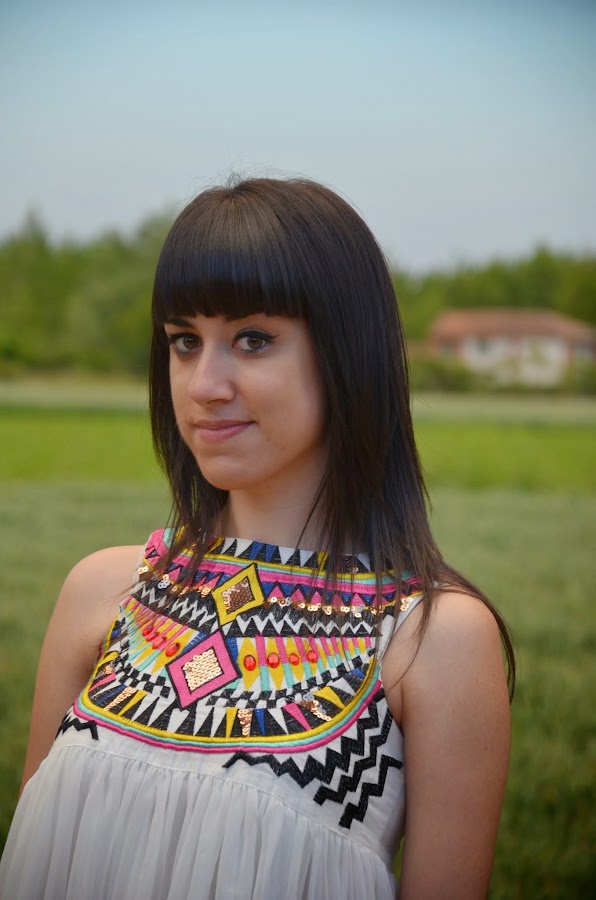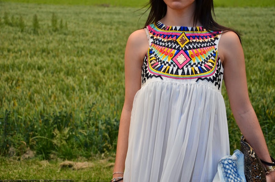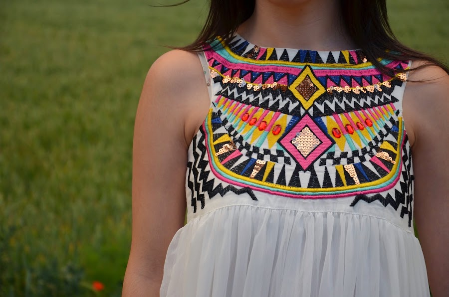 El vestido en cuestión es de la tienda online Sheinside. Un vestido holgado, de gasa en la parte de la falda y bordado el la parte superior con motivos étnicos, con hilos en colores vivos, tachuelas rojas y lentejuelas doradas.