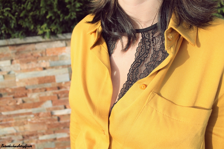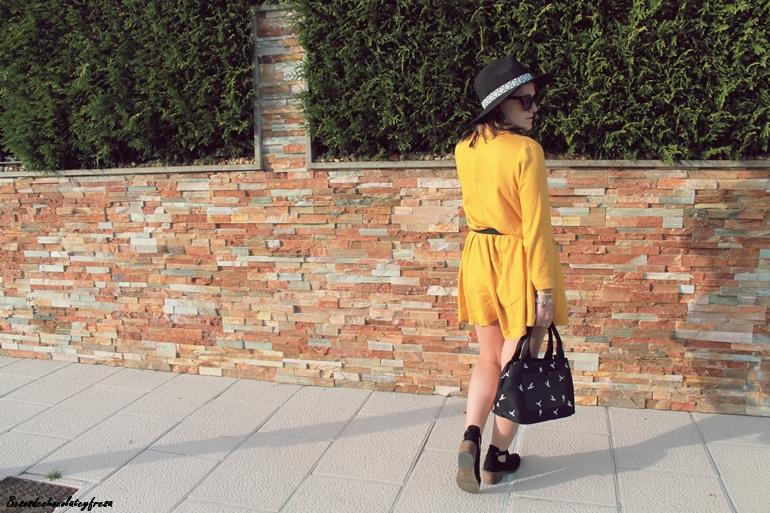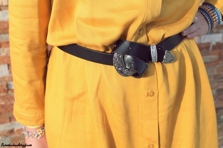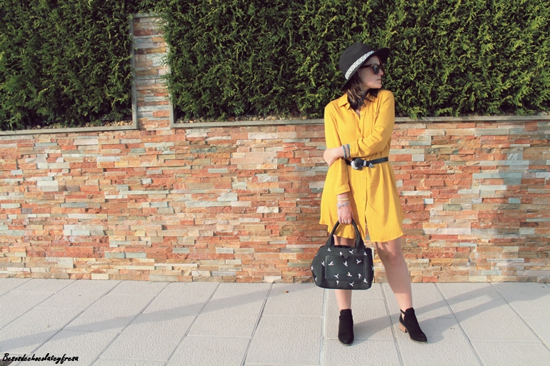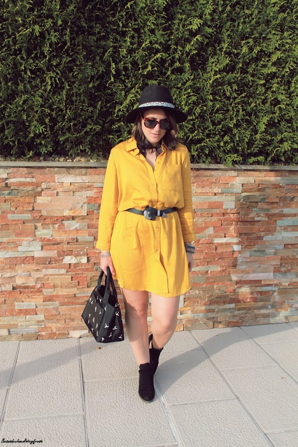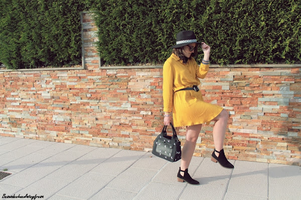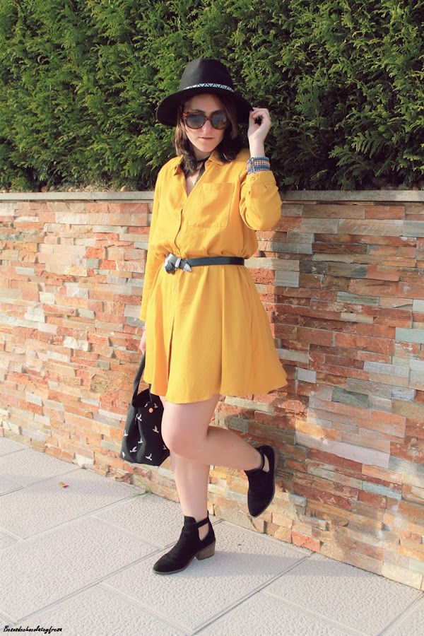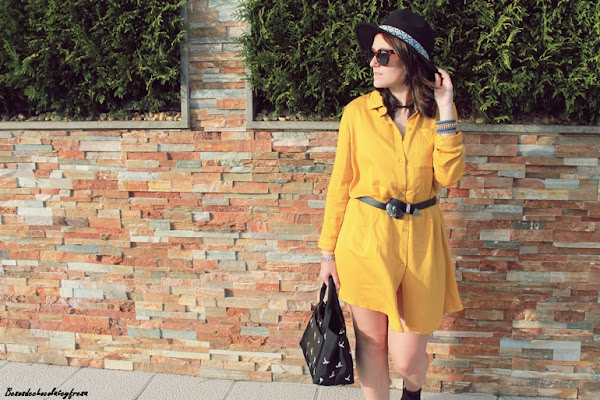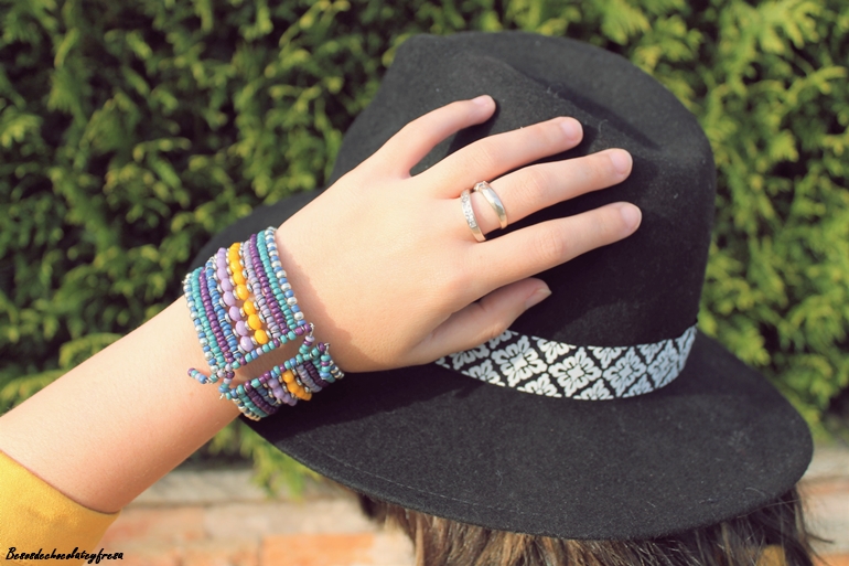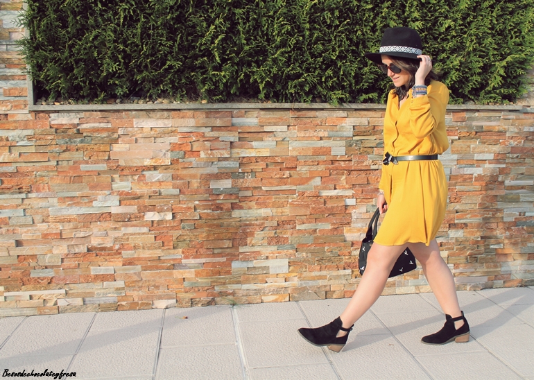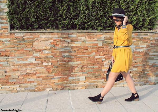Para esta ocasión, aposté por llevar el vestido en un color que va ser todo una tendencia este otoño, el mostaza, con complementos en negro, desde el cinturón anudado a la cintura, los botines de antelina (pues me encanta esta época en la que combinamos botines con pierna al aire, sin necesidad de medias), bolso, sombrero y bra de encaje. A juego con el color mostaza llevo mi nueva pulsera de abalorios y cuentas, uno de los regalos de mi amigos por mi cumpleaños.