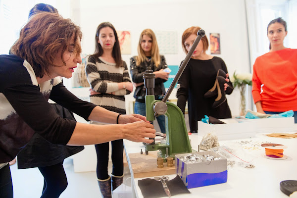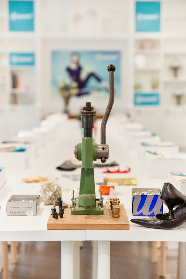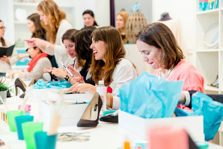 Durante el workshop conocimos la historia de la marca y cómo funcionan exactamente los productos. De ahí pasamos a customizar unos zapatos negros de salón que cada uno decoró al gusto con plumas, tachuelas, brillos, lazos, etc.