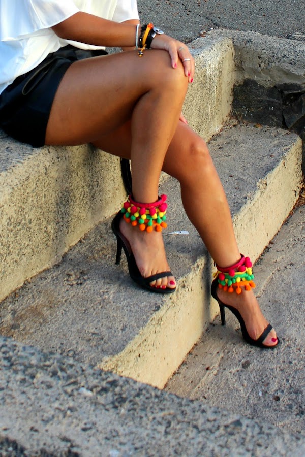 Para subir el outfit escogí estas sandalias que customice con pompones.