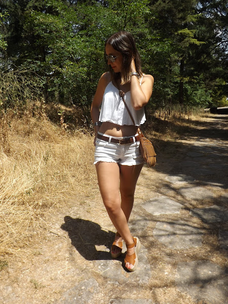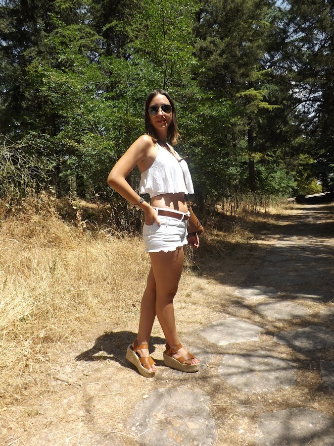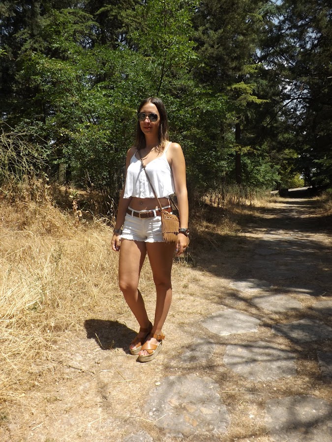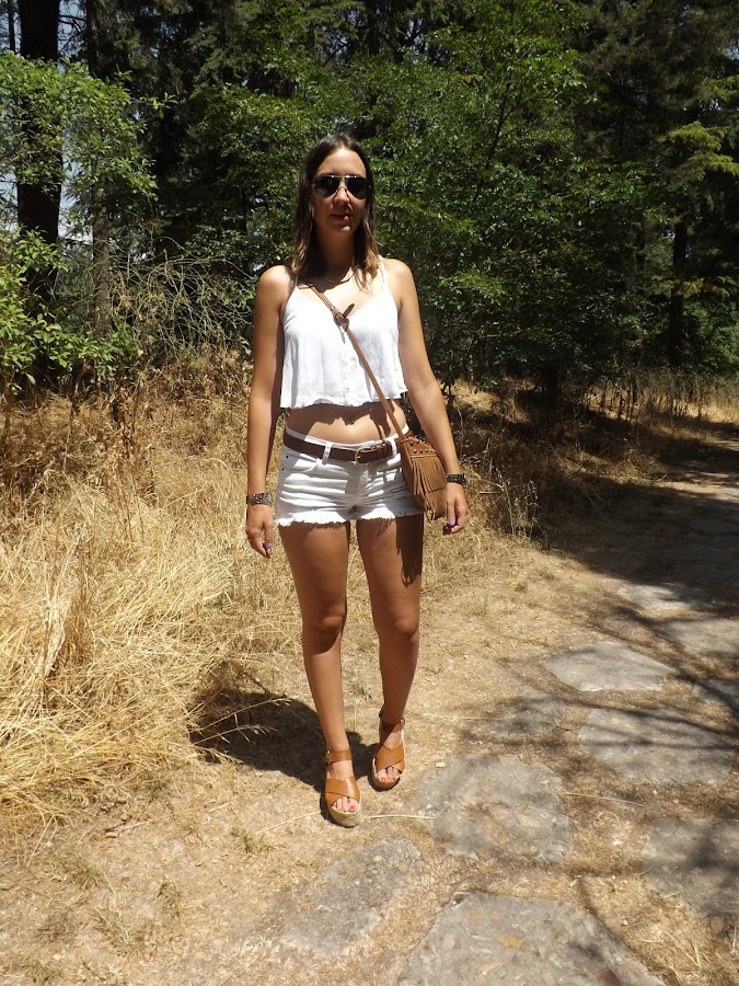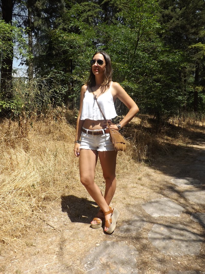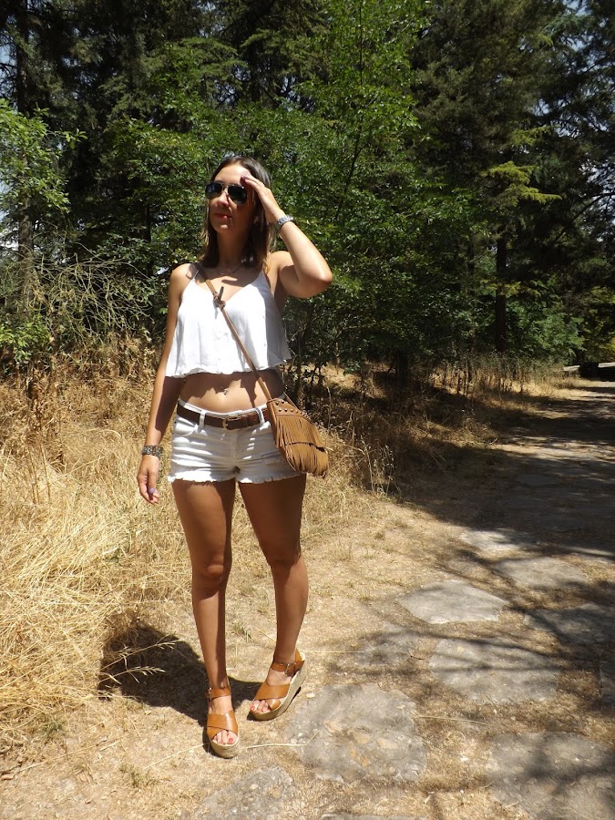 Este día hacía un calorazo importante y como más fresca y cómoda voy es con unos shorts y un top (en este caso con una espalda impresionante) y si son en blanco aún más. El resto de complementos en camel para no romper con los tonos claros.