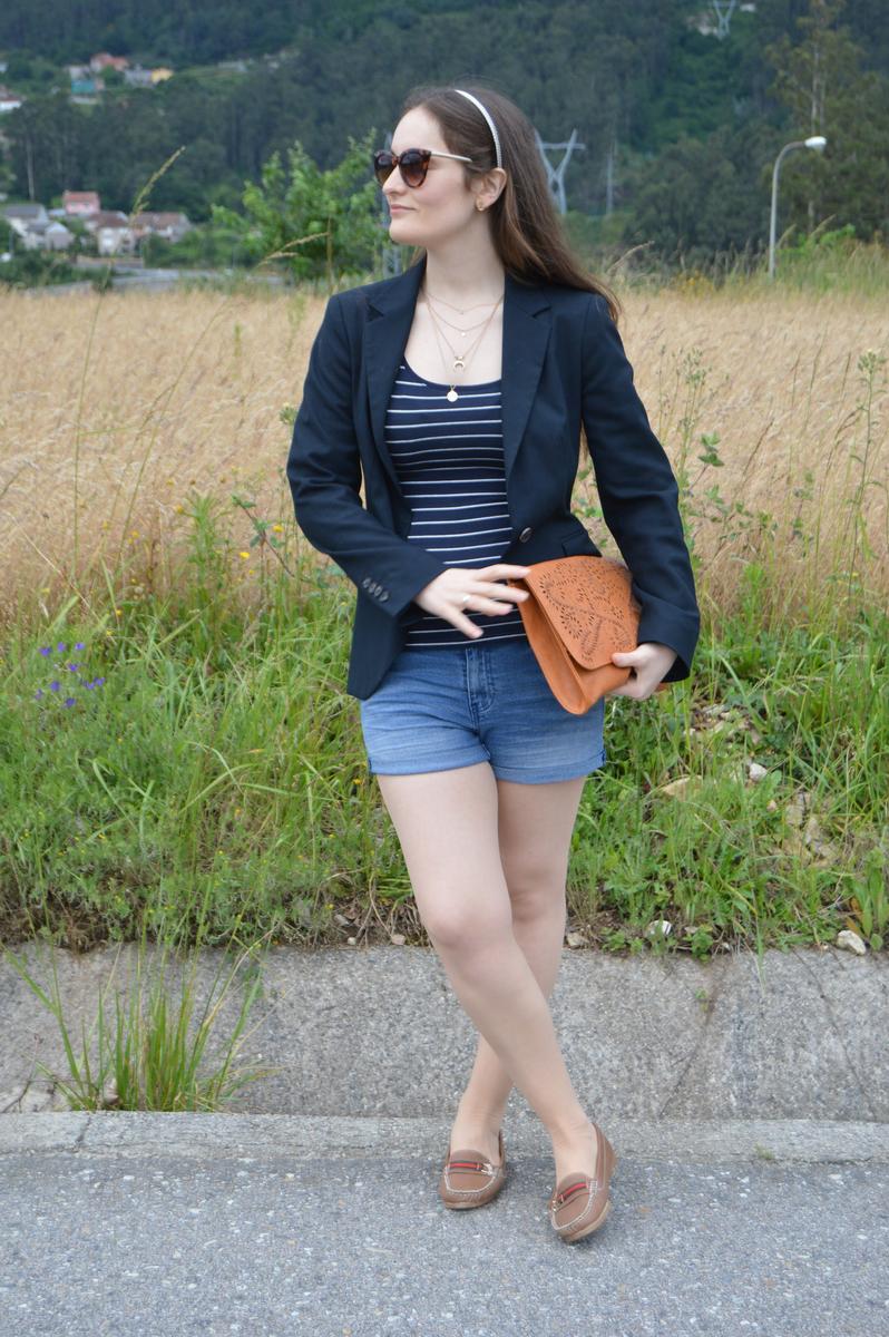 Hoy os traigo un look con otra de las compras que hice el fin de semana pasado. Y son los shorts que veis en las fotos. Los compré en la tienda física de H&M por 4! Mi intención era cortarlos, porque en principio yo iba a comprar unos shorts rotos, pero toda la ropa con rotos estaba mil veces más cara que la normal. Así que como estos tenían un precio al me no me podía resistir, me los compré, los pondré un par de veces y les haré rotos para el verano. Por el resto recuperé la camiseta con rayas navy que llevé en el primer post del blog, una blazer azul de hace unos cuantos años, mis mocasines más cómodos y un clutch. Ah! Y como las perlas en la ropa son tendencia, pero no me acabo de ver con unos pantalones con perlas, me he puesto mi diadema con perlas! Os dejo con el resultado.