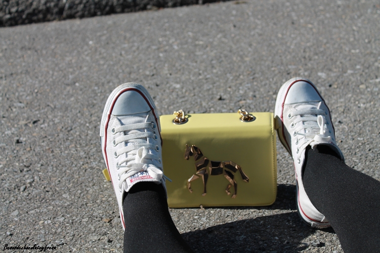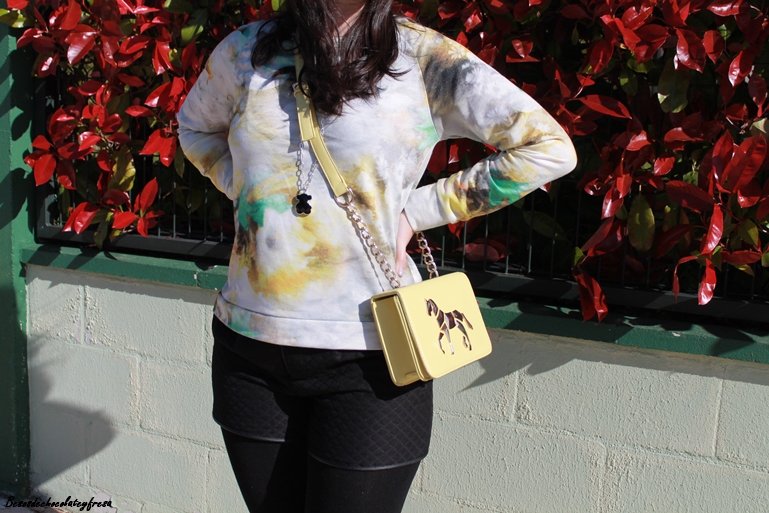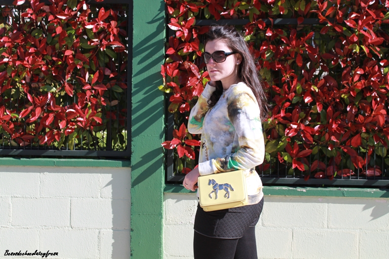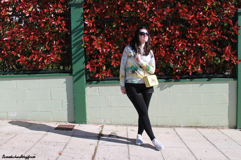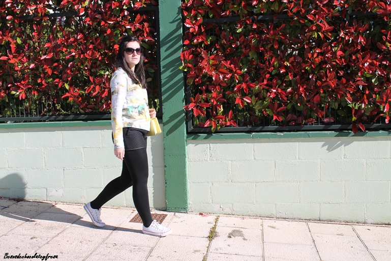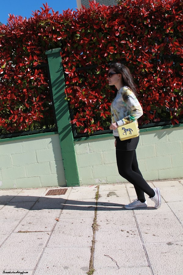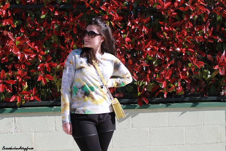 Hoy os muestro un look que puse hace varios días aprovechando que empezaban los días buenos y de sol y para esta ocasión aposté por una sudadera en tonos amarillos y verdes, shorts negros, sneakers y bolso en amarillo.