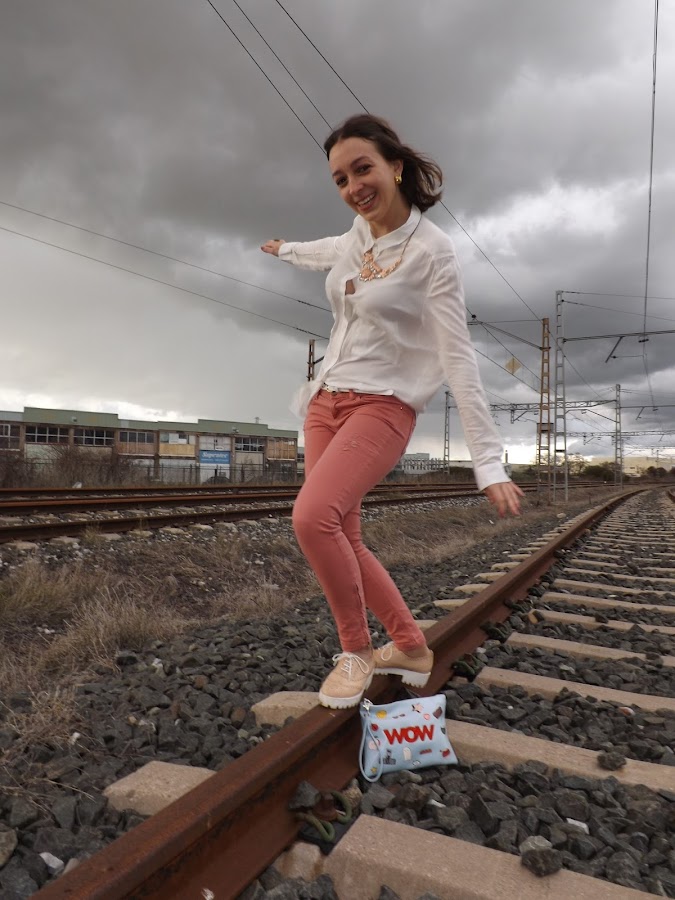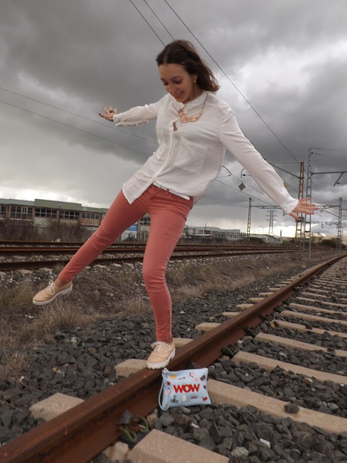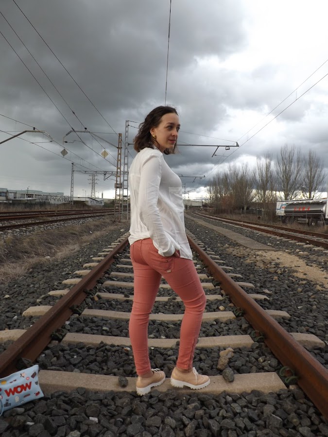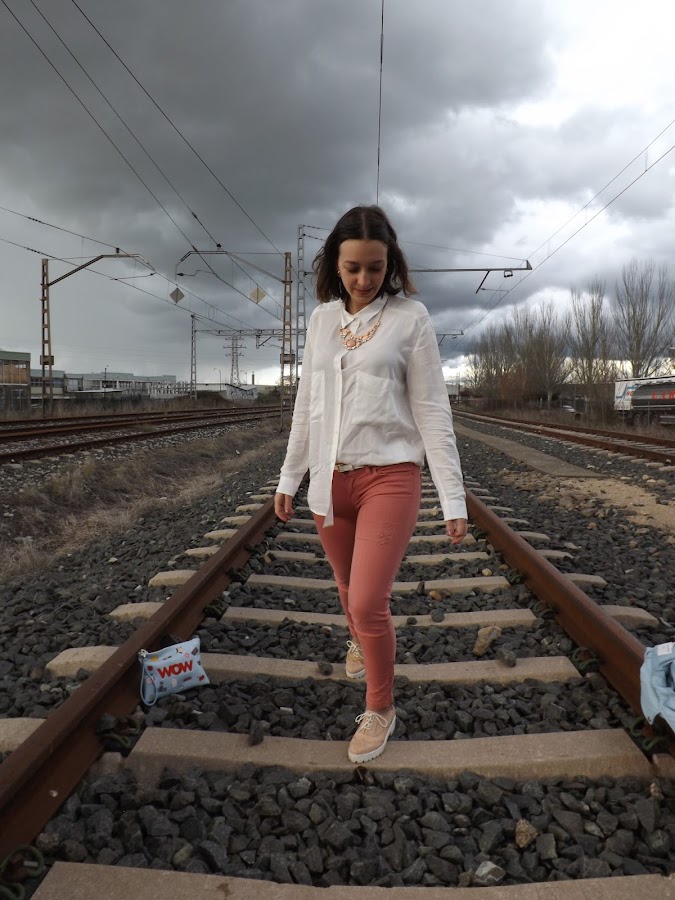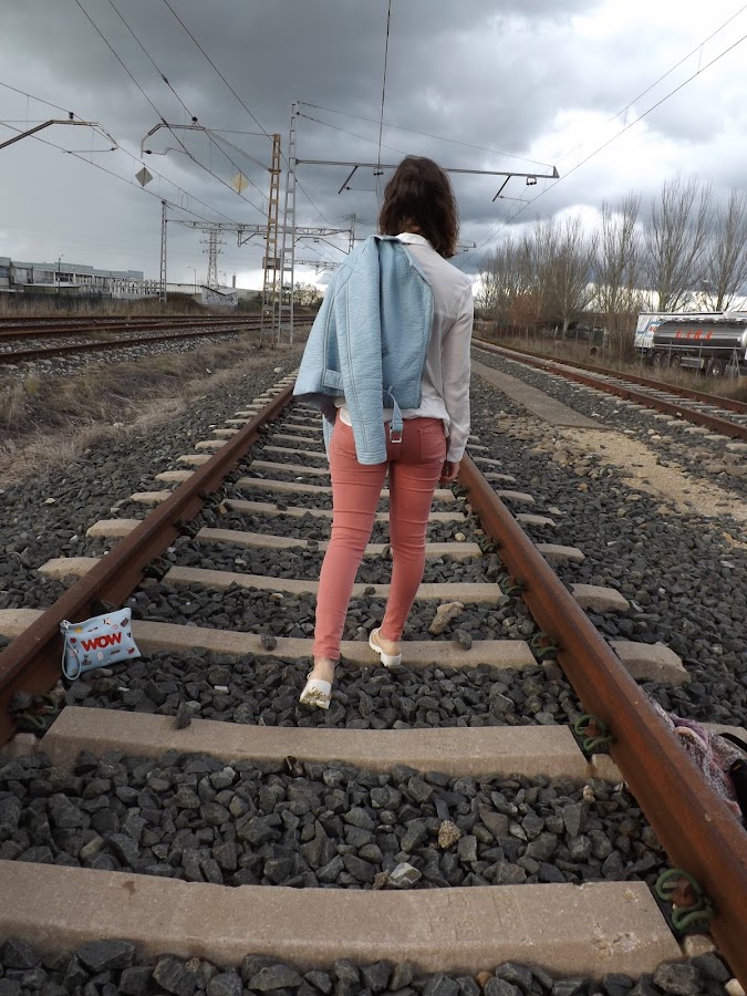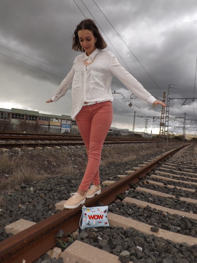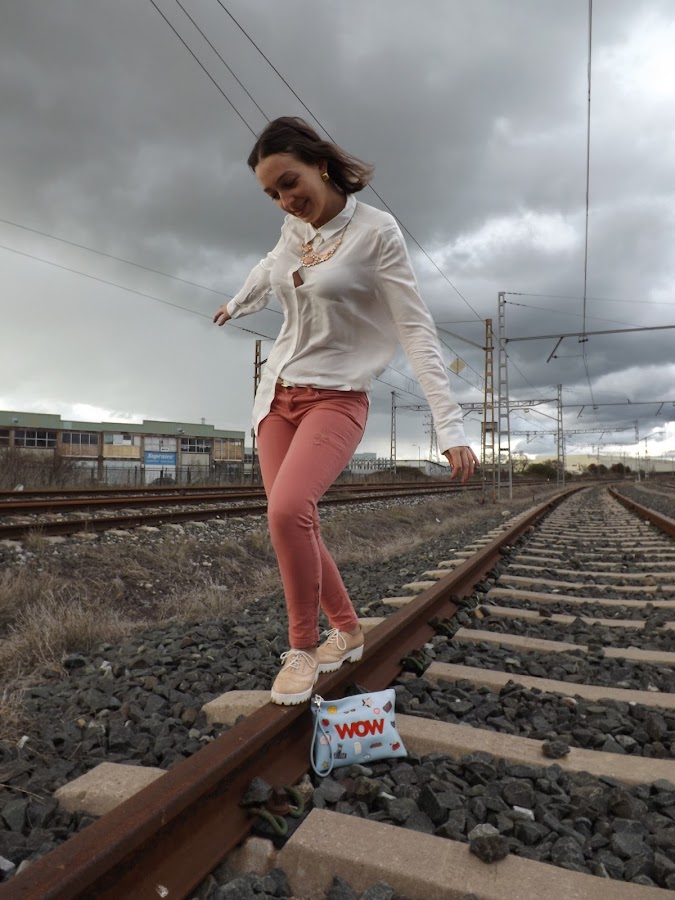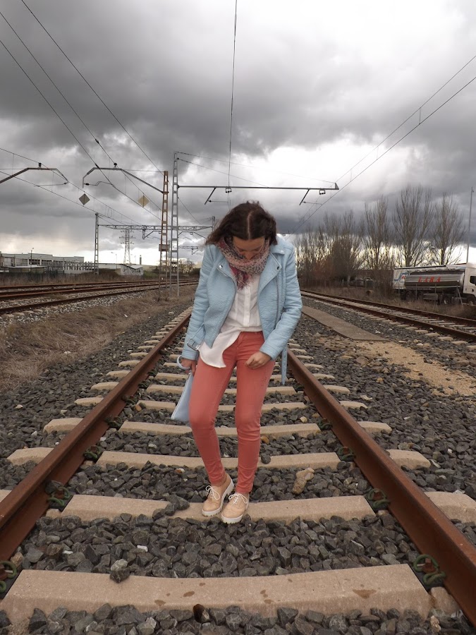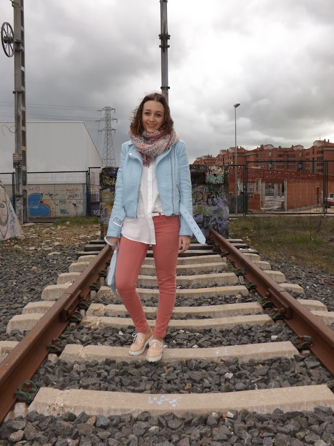 Dejando el tiempo a parte... tenía muchas ganas de estrenar en condiciones esta camisa y creé el outfit en torno a ella. Como quería ponerme también mis amados zapatos, opté por los tonos pastel: jeans rosas y biker y clutch azules.