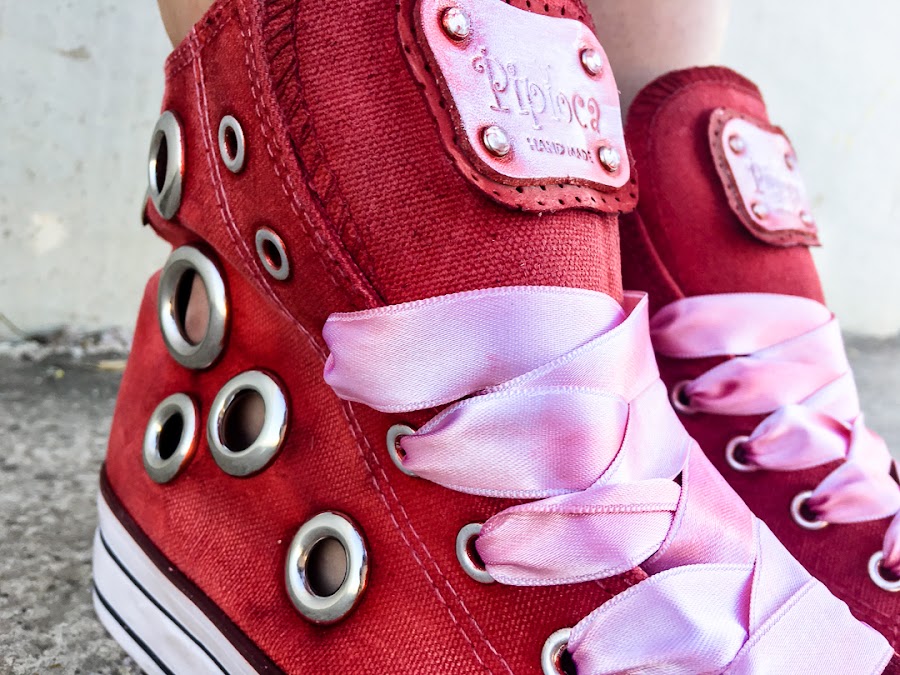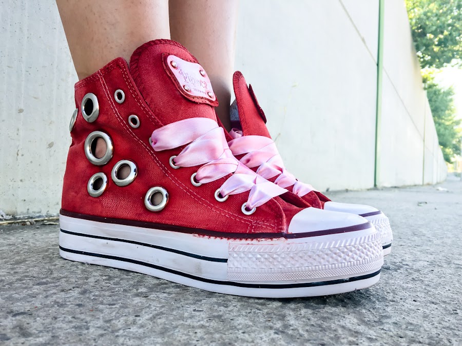 Lo he combinado con un crop top blanco en crochet de ZAFUL, que ya lo visteis anteriormente y mis nuevas sneakers rojas con tachuelas y cordones de satén (vienen también con cordones normales de un color blanco rojizo desgastados, también muy chulos) de Pipioca, que podéis conseguir registrandoos en TRENDY GURU, y mi bolso deportivo de PUMA.