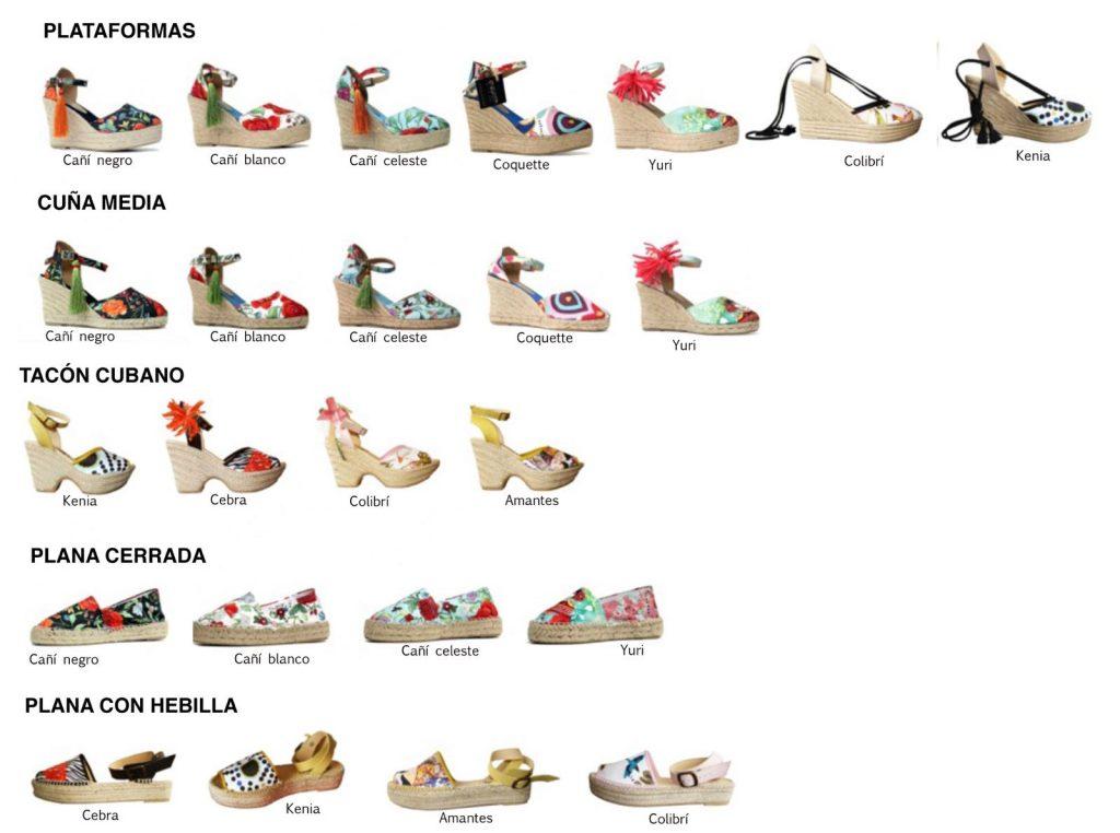 Los diseños se dividen en tres medidas de tacón: Plataformas, cuña media, tacón cubano y como novedad se han incorporado las esparteñas planas y las tipo flatform con hebilla.