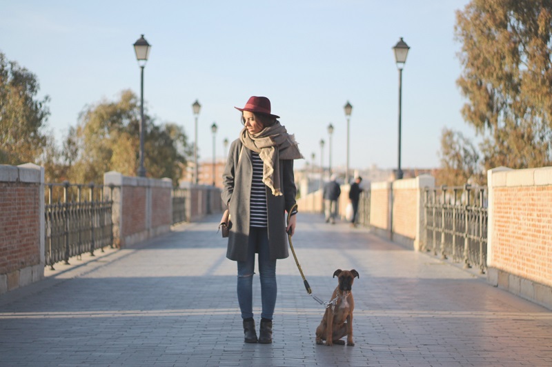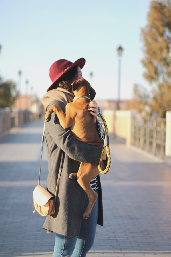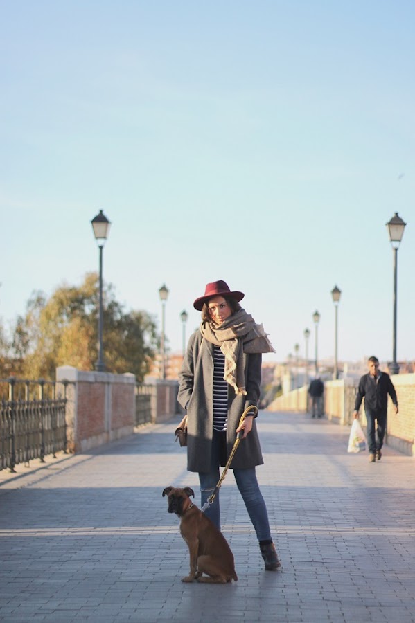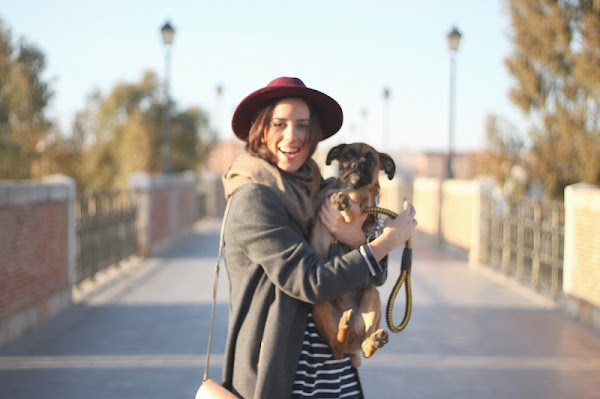 Sacar de paseo a Coco en la hora de la siesta, es la mejor forma de hacer la digestión. Desde luego es para pensarse el calzado, así que botines planos y cómodos para estar dispuesta a correr, la próxima desde luego dejo el sombrero en casa porque estuvo más tiempo en el suelo que en la cabeza. Bufanda-manta que le robo a mi chico, jeans con camiseta marinera, y abrigo clásico vintage.