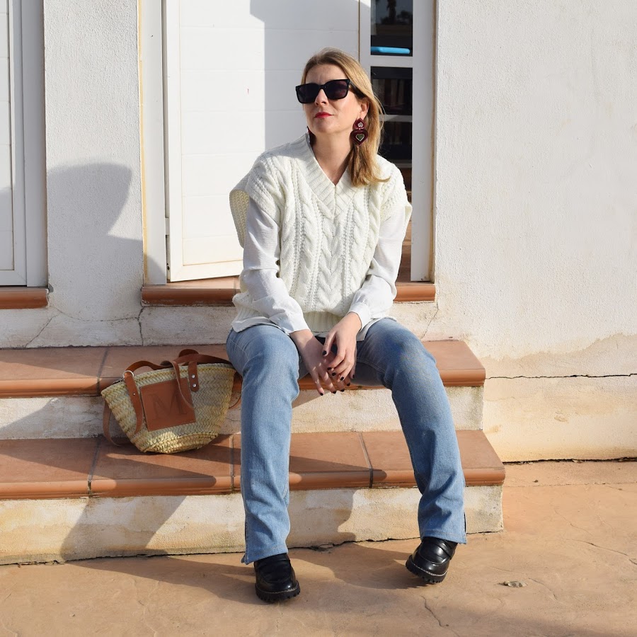 Compuesto de vaqueros y camisa blanca, el toque especial lo da el propio chaleco, los mocasines de tacón, y mi bolsito personalizado.
