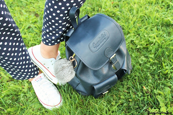Wear pants in navy and white polka dots, blue basic sweatshirt (has only one pocket and lyrics, super loving), sneakers and backpack also in navy blue. What do you think?