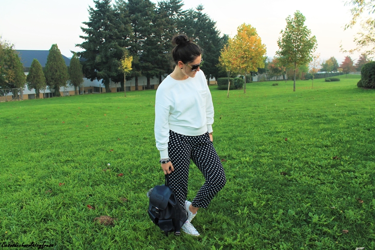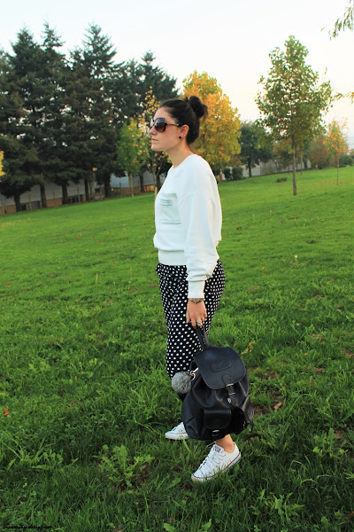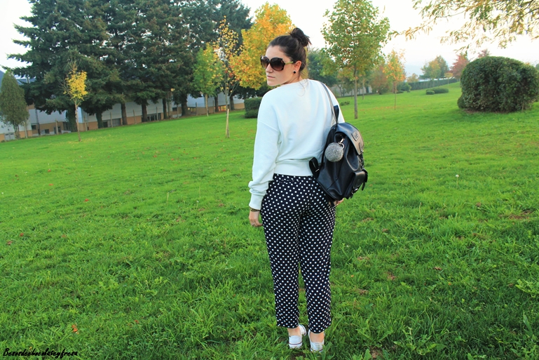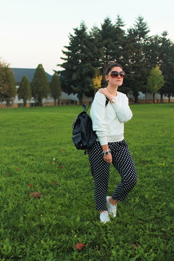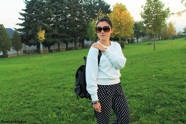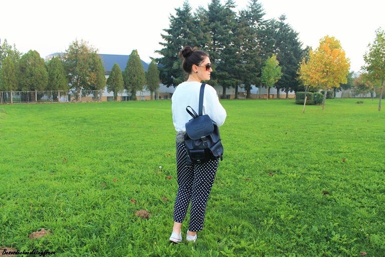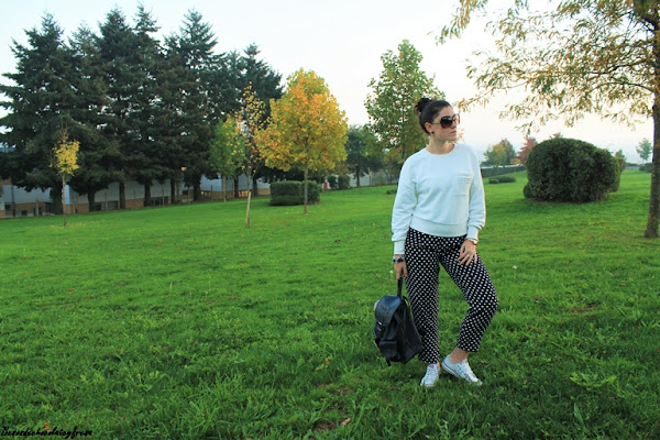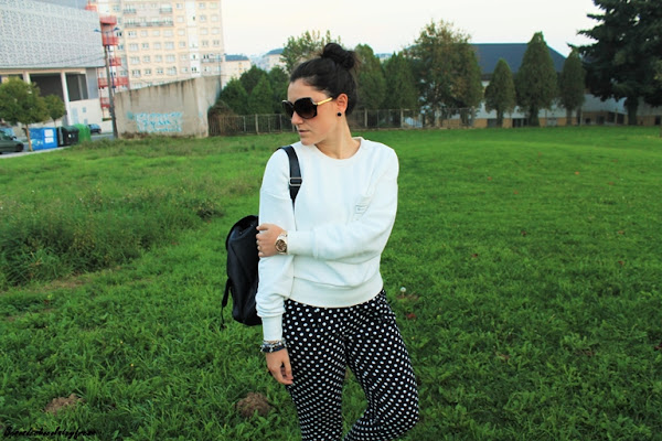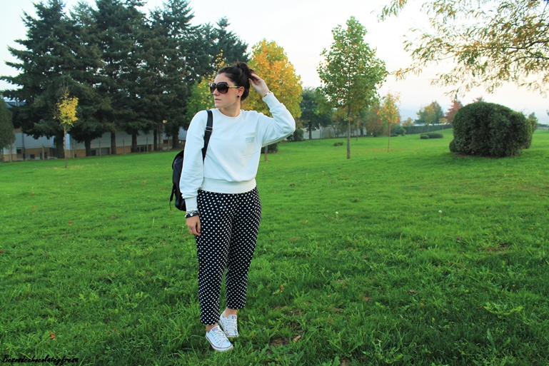 Llevo pantalones de lunares en azul marino y blanco, sudadera básica (solo tiene un bolsillo y unas letras, super amorosa), sneakers y mochila también en azul marino. ¿Qué os parece?