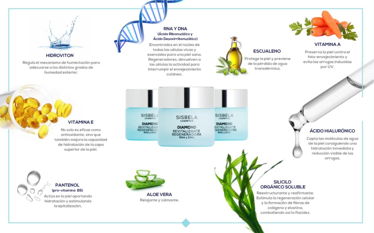 Principios activos: RNA y DNA (Ácido Ribonucléico y Ácido Desoxirribonucléico), Hidroviton, Escualeno, Vitamina A, Vitamina E, Ácido Hialurónico, Pantenol (Pro-vitamina B5), Aloe Vera, Silicio Orgánico Soluble.