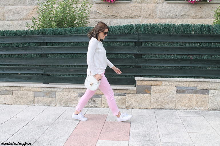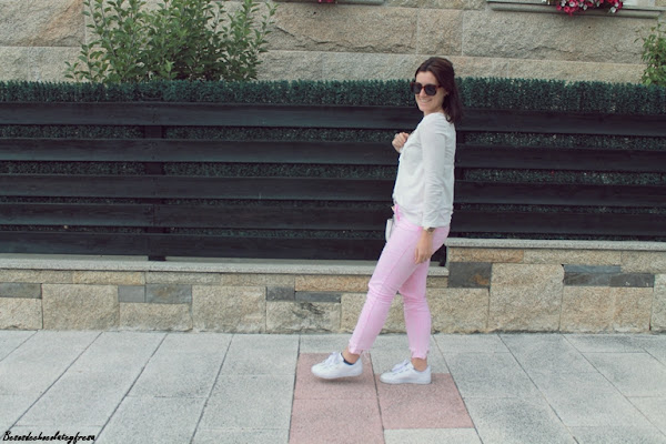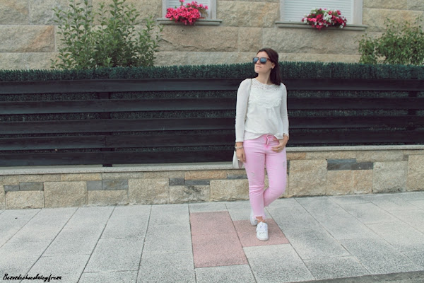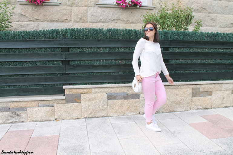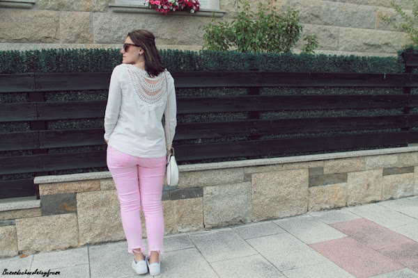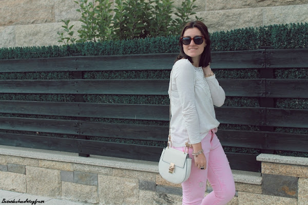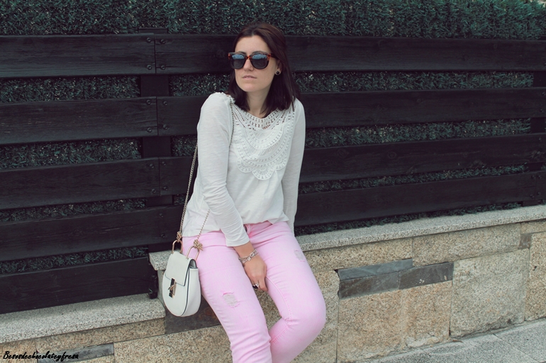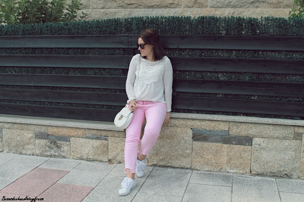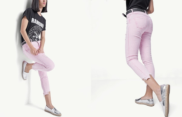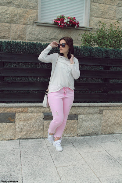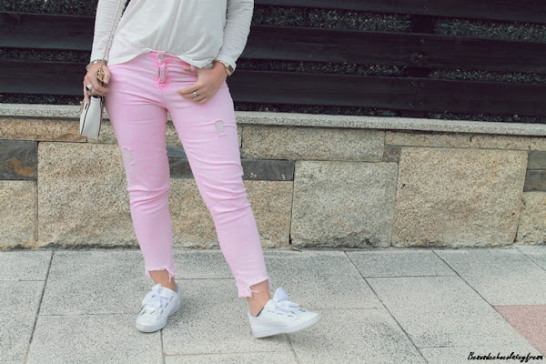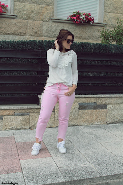 Uno de los colores del verano es el rosa, y en el look de hoy vengo con este color, concretamente con el rosa empolvado de estos jeans estilo skinny que me compre la semana pasada en las rebajas a muy buen precio, por menos de 10. Un efecto teñido rosa y desflecado en el bajo con rotos que sienta genial para llevar con infinidad de prendas y colores.
