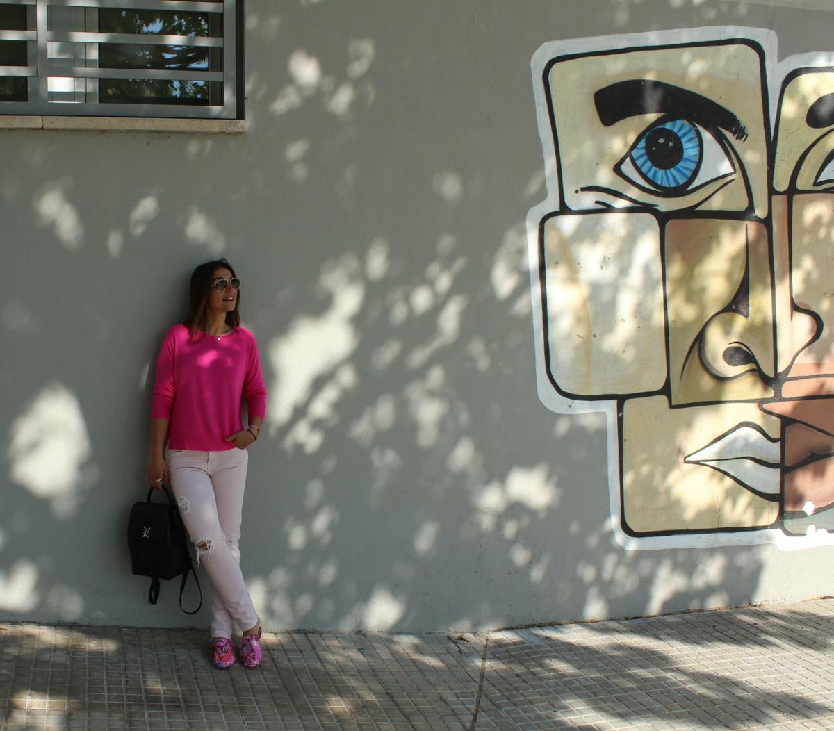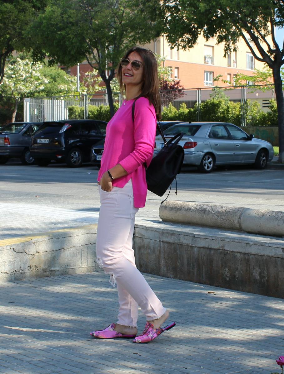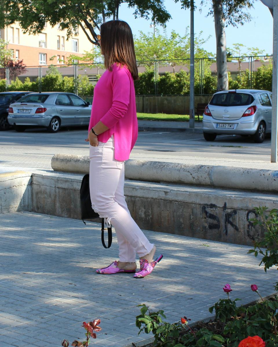 En mi caso elegí estos slippers de color rosa con bordados de flores y adornados con predrería en la parte superior. Combinados con pantalones rotos y jersey, los dos en rosa, repasando la paleta de tonos de uno de los colores del verano.