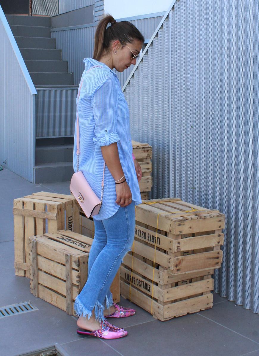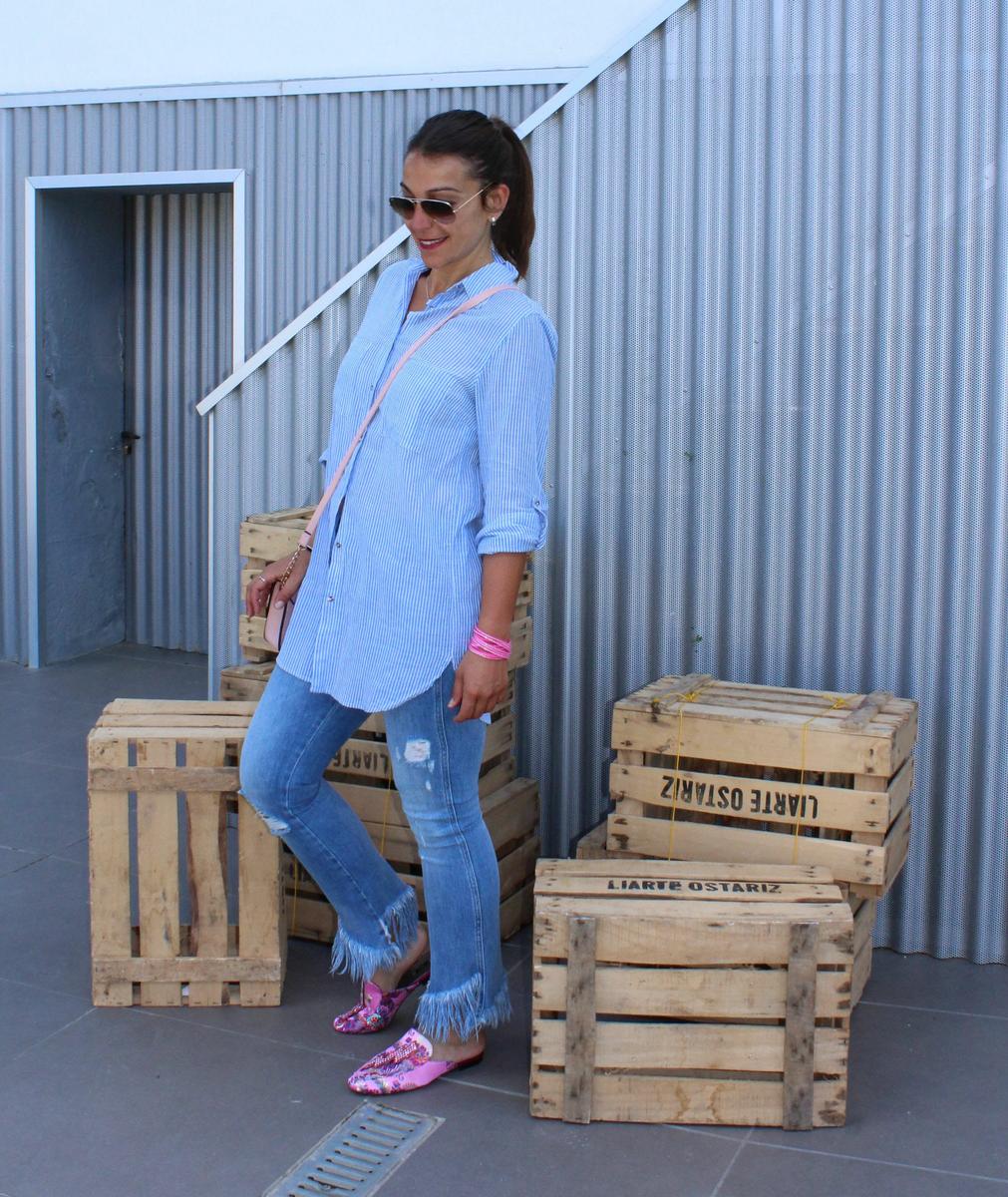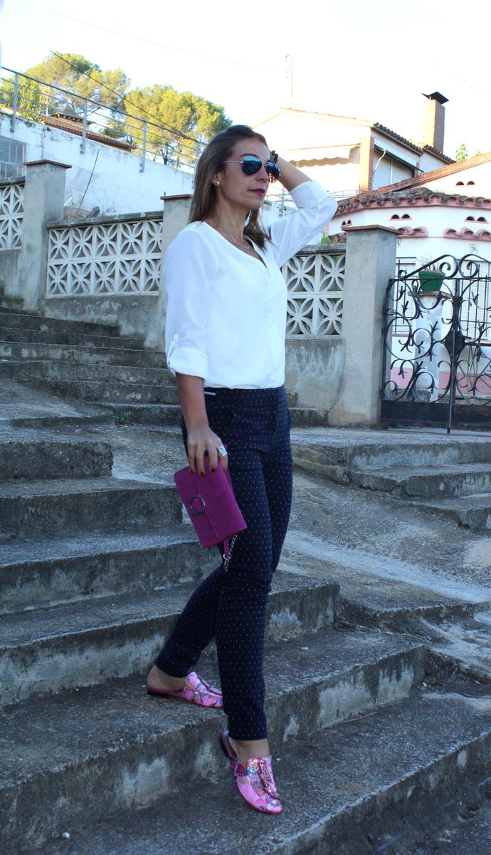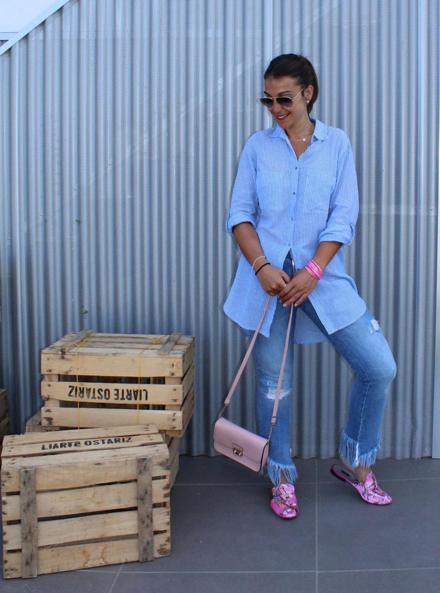 El primero es un look totalmente informal y relajado, compuesto por jeans desflecados y camisa oversize. En el segundo en cambio, buscaba algo más formal y arreglado, compuesto por pantalón recto en color azul marino salpicado de pequeños topos y camisa blanca.