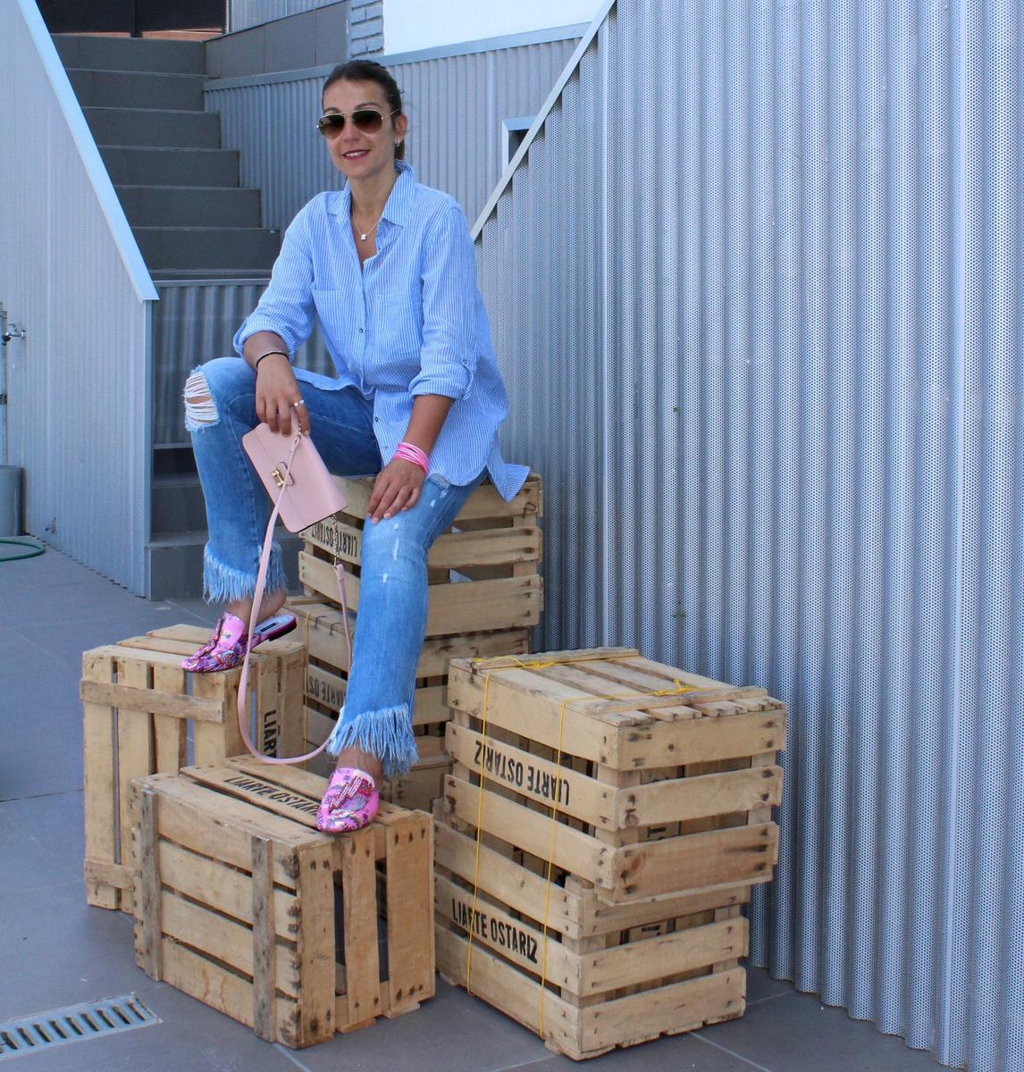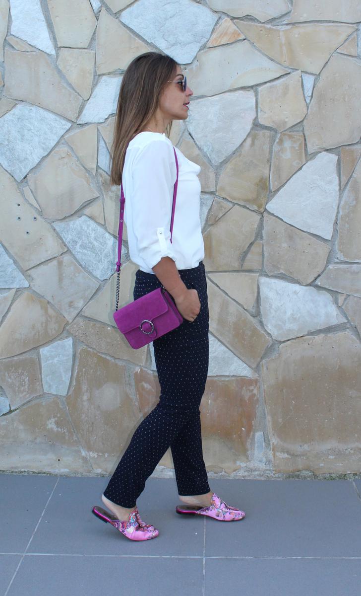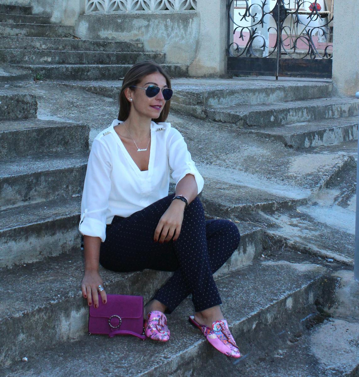 El primero es un look totalmente informal y relajado, compuesto por jeans desflecados y camisa oversize. En el segundo en cambio, buscaba algo más formal y arreglado, compuesto por pantalón recto en color azul marino salpicado de pequeños topos y camisa blanca.
