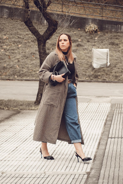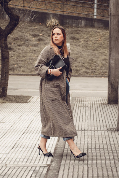 Elegí este modelo porque me parece un básico de armario que puedes combinar con cualquier cosa. En este caso, cuello cisne negro, abrigo largo en tonos marrones y negros y zapatos de tacón. Todo super básico, pero aún así, me parece que ha quedado un look muy chulo y con bastante rollo.