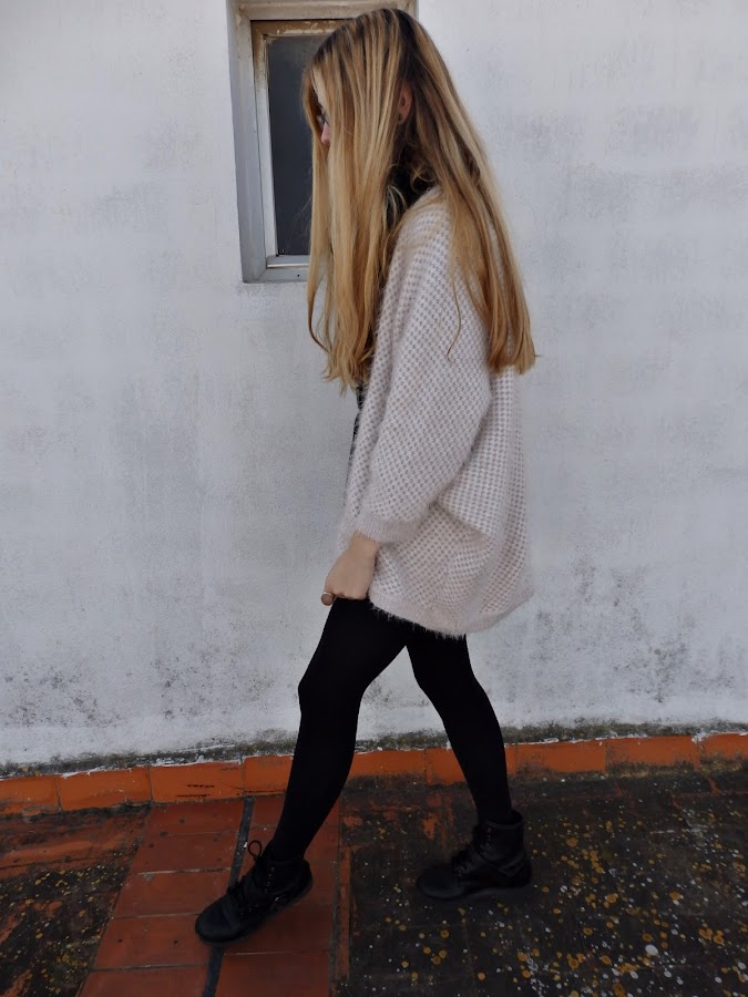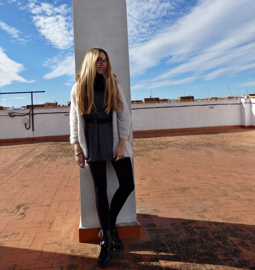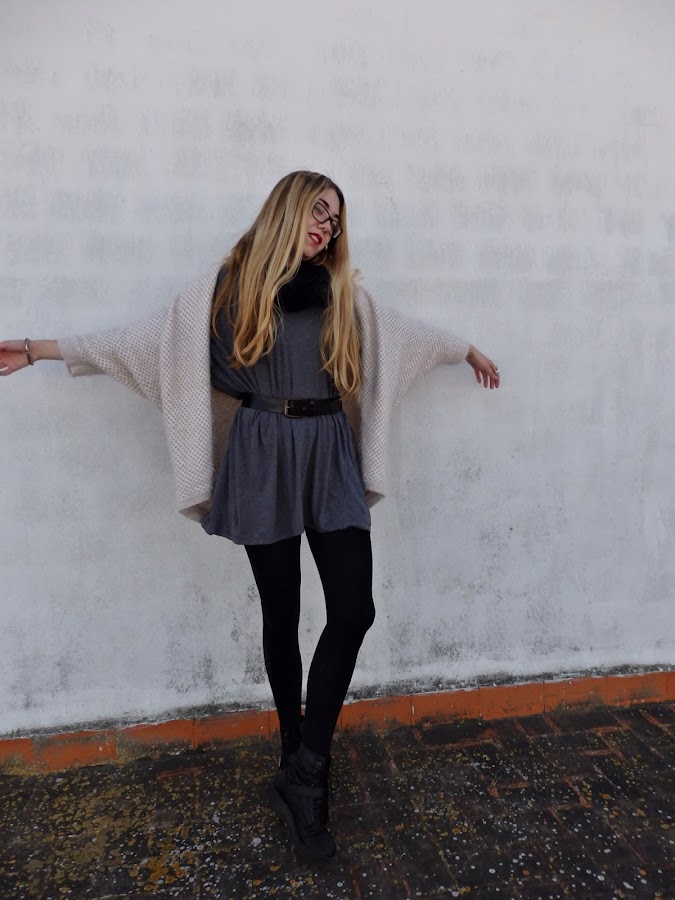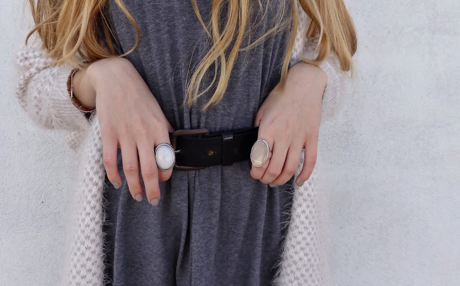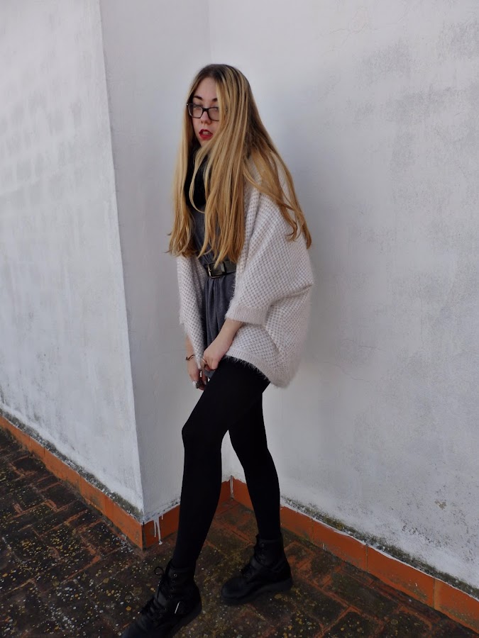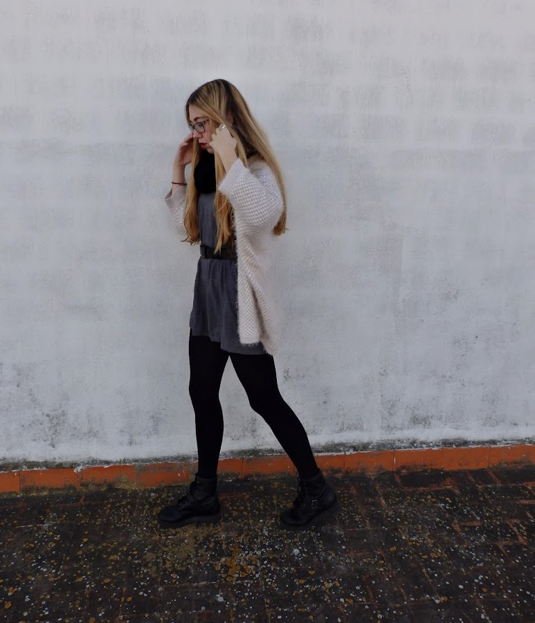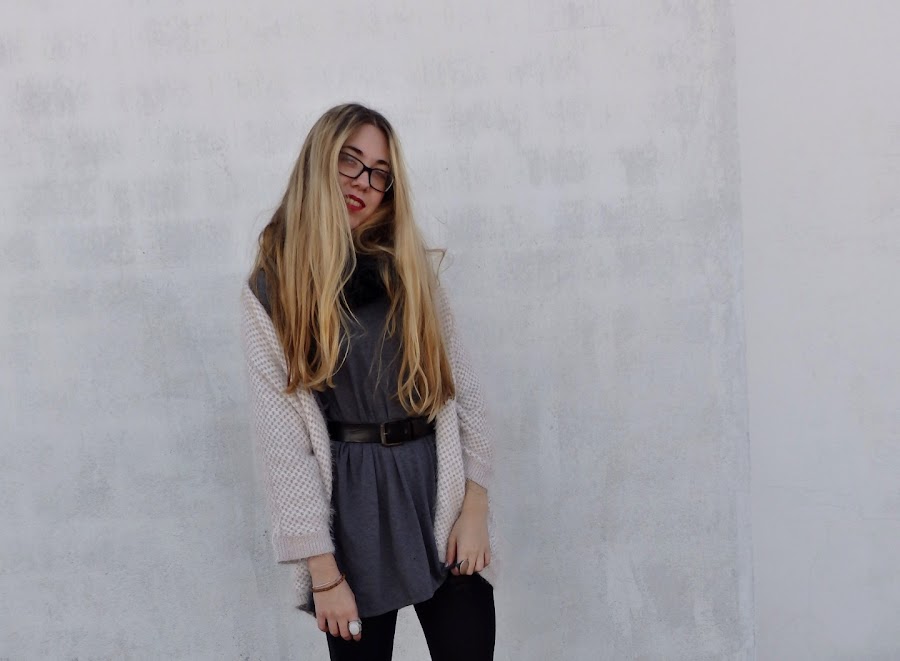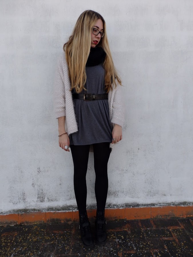 El outfit que hoy os enseño está compuesto por una camiseta gris bastante oversize que he utilizado a modo de vestido, acompañándola con un cinturón de cuero que hace que esta coja forma. Como hace frío he decidido acompañar el conjunto con un cárdigan de pelito color rosa palo, que creo que contrasta bastante bien con el gris.