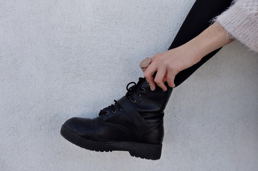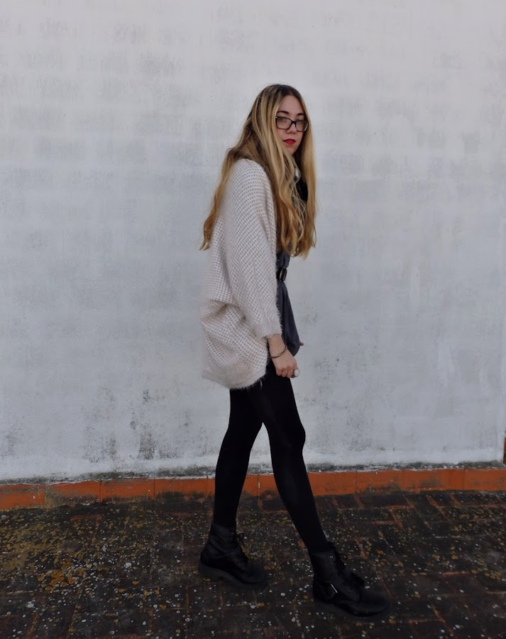 Como calzado llevo las botas negras de estilo militar que rompen con el estilo más lady del outfit. Como accesorios simplemente he elegido dos anillos, uno con una piedra blanca y otro con una en color topo, ambos siguen la tonalidad del cárdigan.