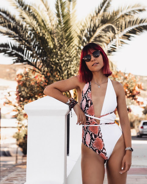 Y sabéis como se quita el estrés?? Estrenando bikinis nuevos de SHEIN!! En este caso, un bañador! Y es súper chulo! Mitad blanco, mitad estampado de serpiente en un tono anaranjado. Además, podéis cruzar los tirantes como queráis, ya que son multiposición! Es de escote en V, que llega hasta el ombligo y espalda totalmente descubierta! Os dejo también su ID: 697611