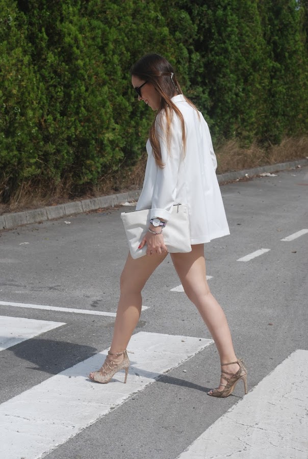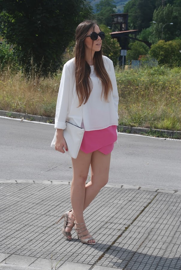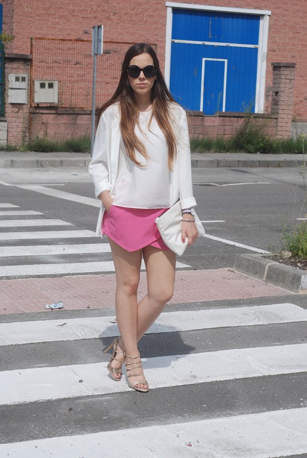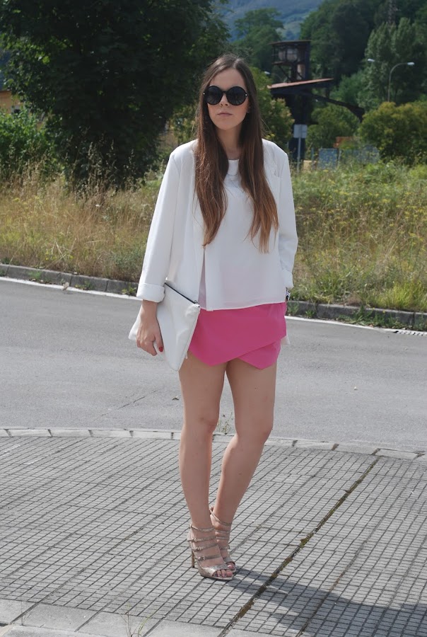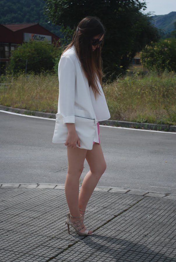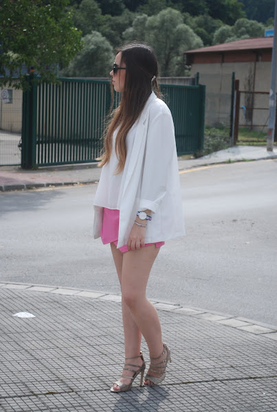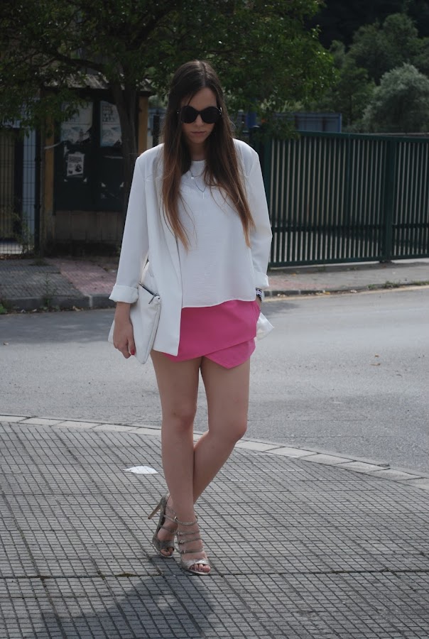 Hemos tenido un fin de semana estupendo (omitiendo el viernes que hizo un día horrible), así que el sábado aproveché para estrenar mis nuevas sandalias de tacón con print de serpiente. Para acompañarlas falda origami rosa, camisa y mi nuevo blazer oversize (ya lo tenía en negro, azul, gris y marrón, necesitaba el blanco).