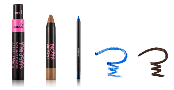 Double Effect Volume Mascara: Mascara dos en uno con una fórmula cremosa, aterciopelada, flexible y ligera que recoge las pestañas y desde la raíz hasta las puntas.